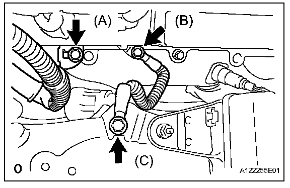 e. Install the ground cable with the 2 bolts (B, C).