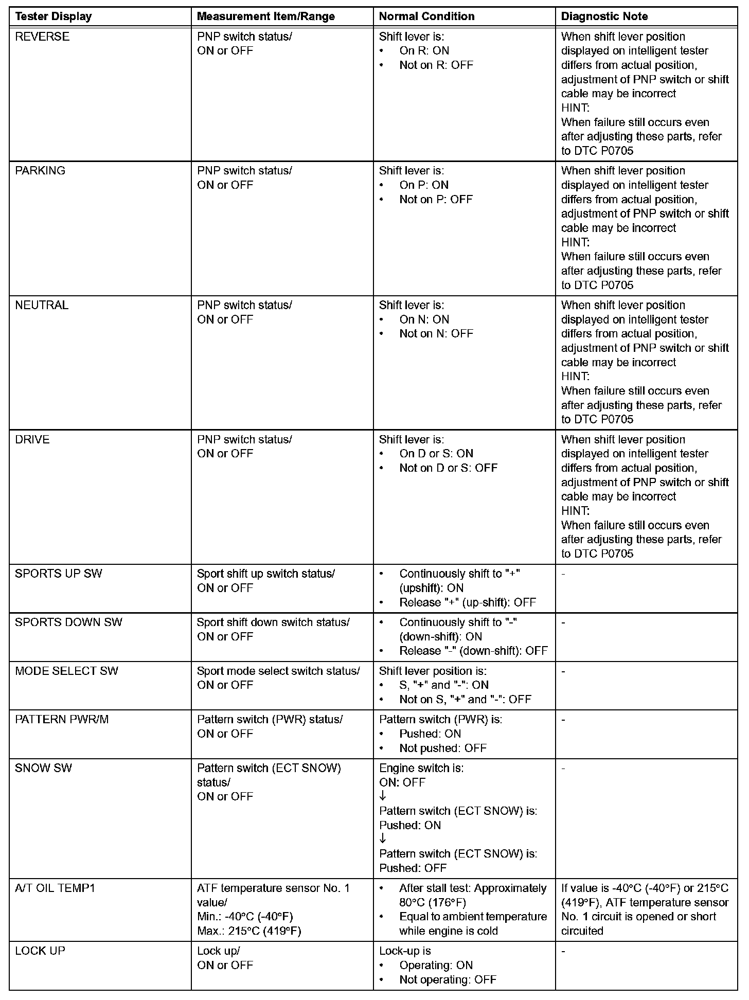 HINT: Using the intelligent tester DATA LIST allows switch, sensor, actuator and other item values to be read without removing any parts. Reading the Data List early in troubleshooting is one way to shorten labor time.