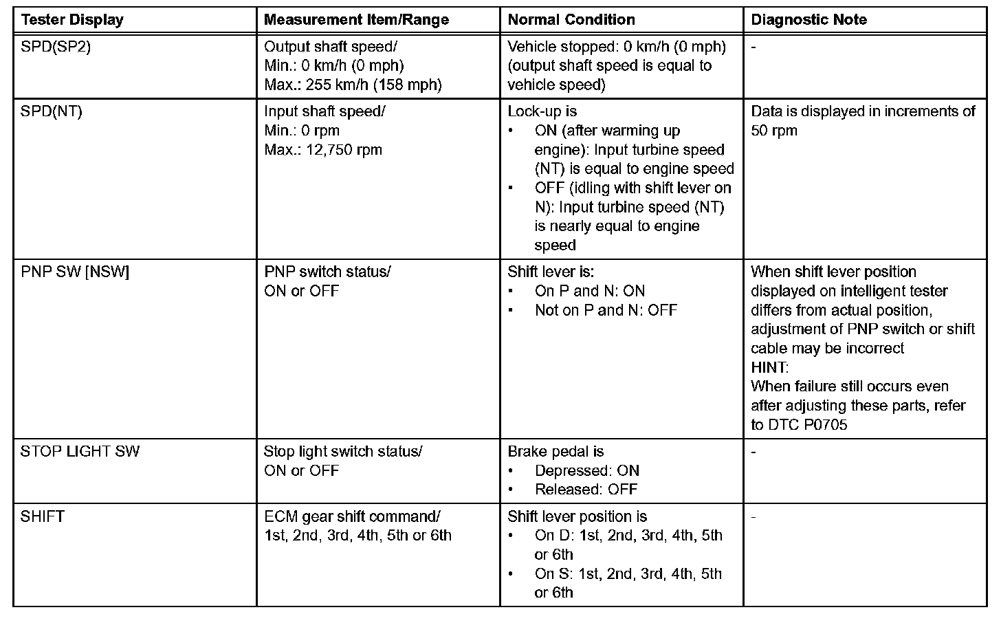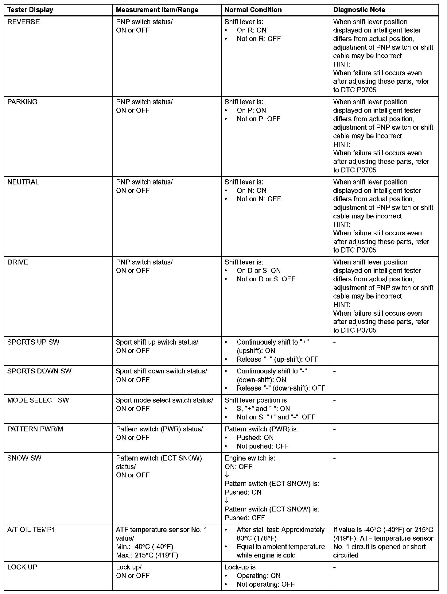 HINT: Using the intelligent tester DATA LIST allows switch, sensor, actuator and other item values to be read without removing any parts. Reading the Data List early in troubleshooting is one way to shorten labor time.