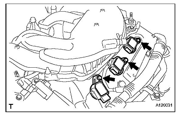 c. Remove the 6 bolts and the 6 ignition coil assemblies.