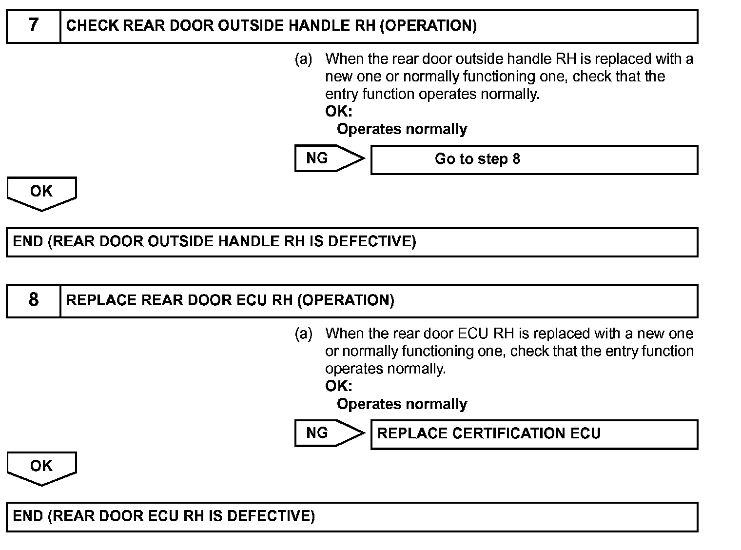 If the rear right door entry unlock function does not operate but the entry lock operation operates, the communication line between the vehicle and electrical key transmitter is normal. Either of the following may have occurred: 1) the door outside handle touch sensor is malfunctioning; or 2) the rear door ECU RH receives the door outside handle touch sensor ON signal, but is unable to send the signal to the certification ECU through CAN communication.