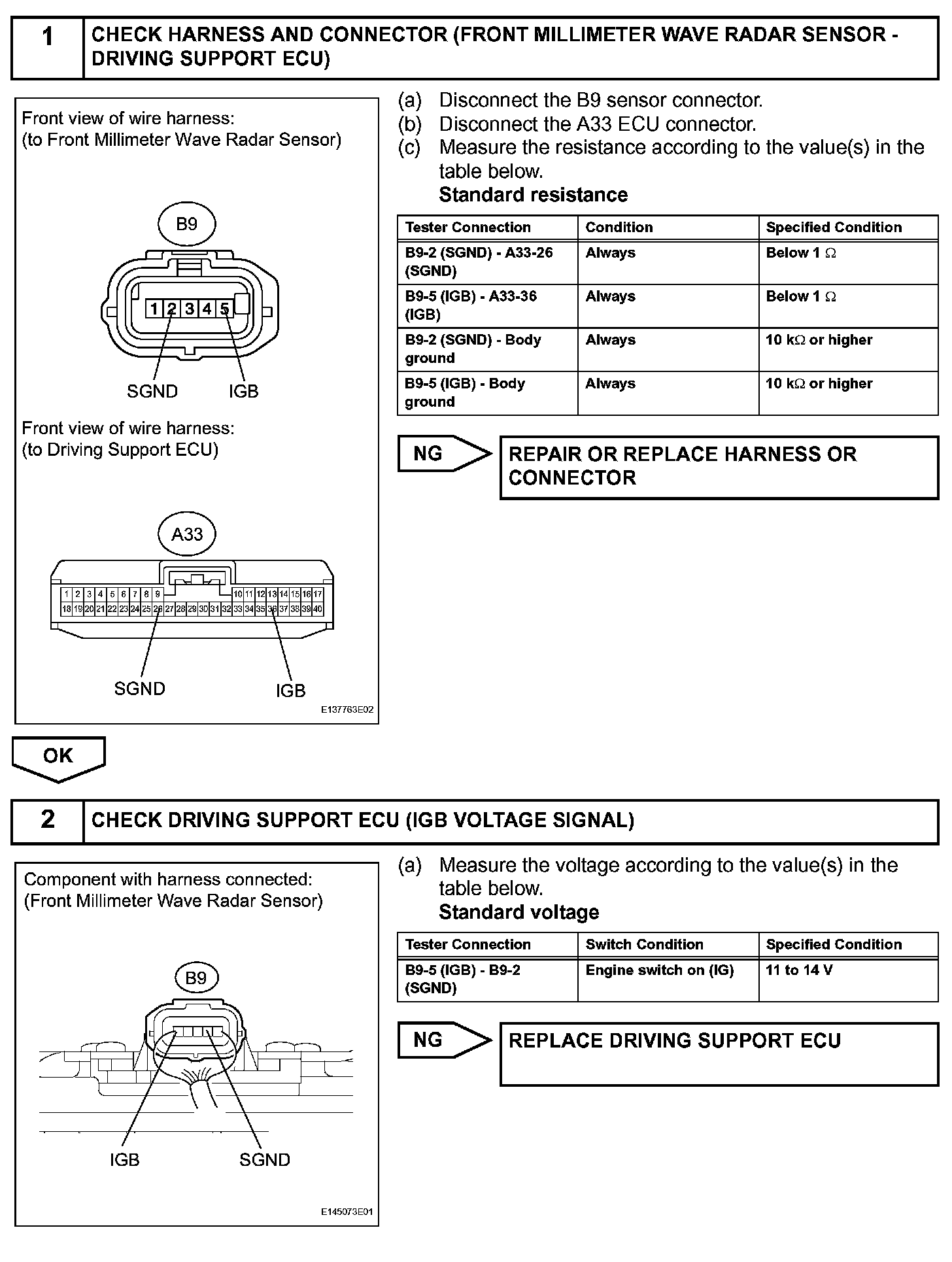 This circuit provides power to the front millimeter wave radar sensor. The front millimeter wave radar sensor emits radio waves towards an object in front and measures the distance and direction of the object by receiving the beam reflections. Based on the reflections, the sensor calculates the difference in speed between the vehicle and the object in front. This data is transmitted to the driving support ECU.