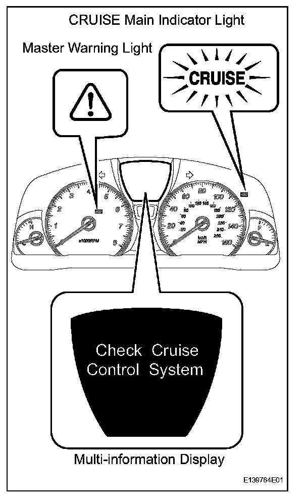 a. The diagnosis function makes the master warning light and the multi-information display turn on, and the CRUISE main indicator light blinks as shown in the illustration. When a malfunction occurs in the dynamic radar cruise control system, the DTCs are stored in the driving support ECU.