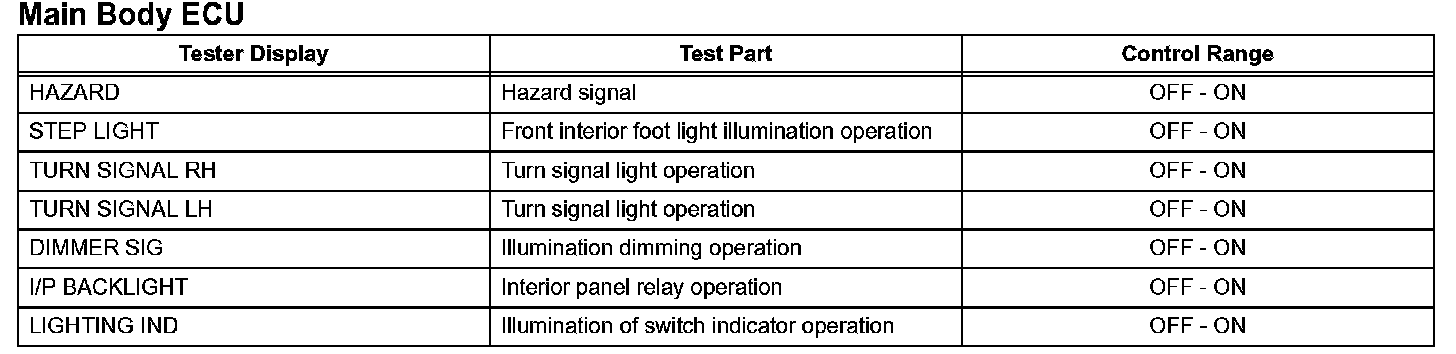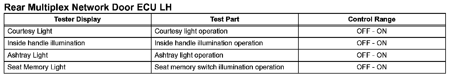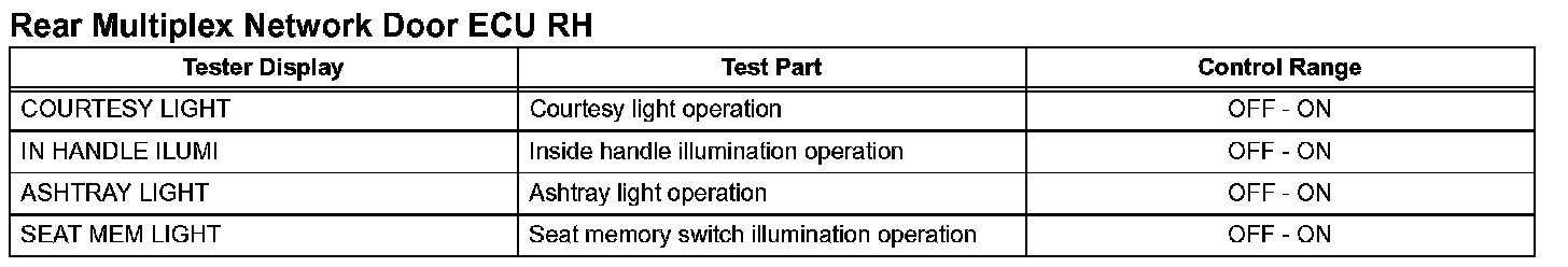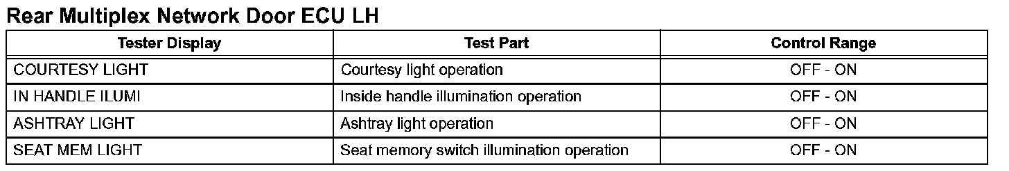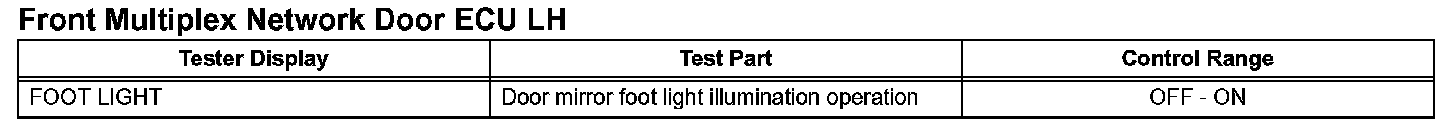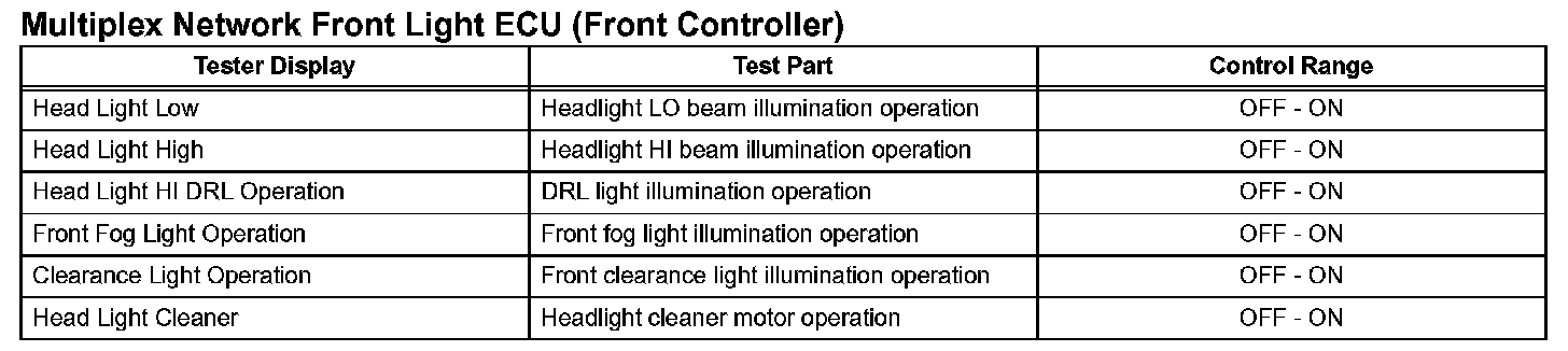 ACTIVE TESTNOTE: When a Rear Junction Block ECU and Multiplex Network Front Light ECU (Front Controller) related vehicle switch is ON, Active Test items related to the vehicle switch are prohibited (double operation prohibition). Check that the vehicle switches are OFF before performing Active Tests.