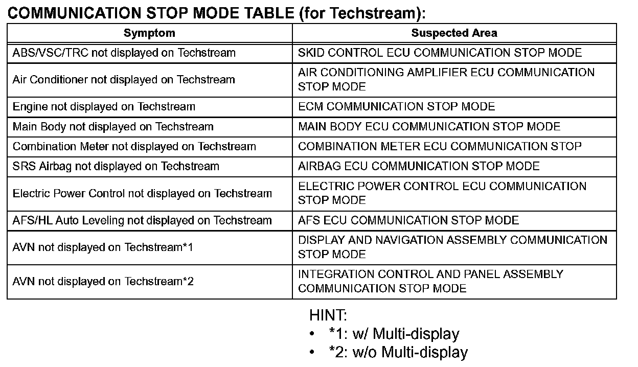 Problem Symptoms Table-Communication Stop Mode Table (For Techstream):