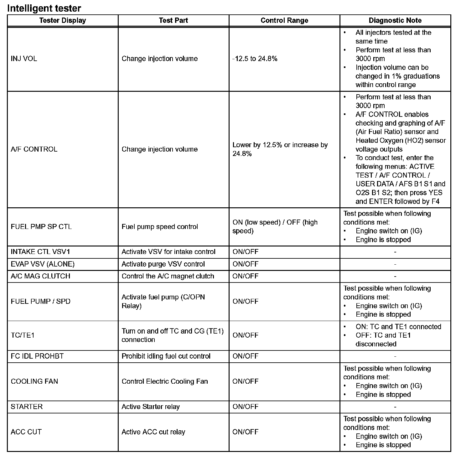 ACTIVE TESTHINT: Using the intelligent tester or Techstream to perform the Active Tests allows relays, VSVs and actuators and other items to be operated without removing any parts. This non-intrusive functional inspection can be very useful because intermittent operation may be discovered before parts or wiring is disturbed. Performing Active test early in troubleshooting is one way to save diagnostic time. Data List information can be displayed while performing Active Tests.