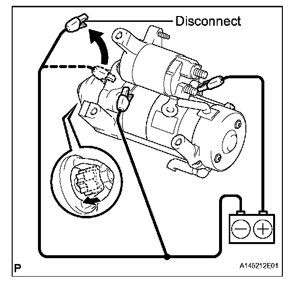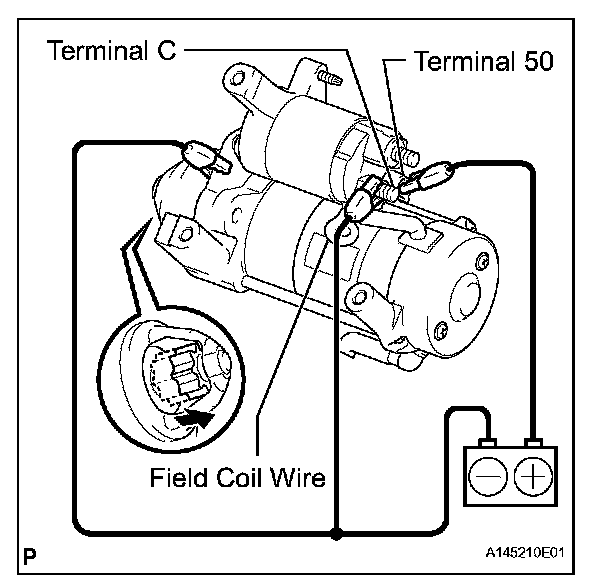 1. Disconnect the negative (-) lead from the starter body. Check that the clutch pinion gear moves inward.