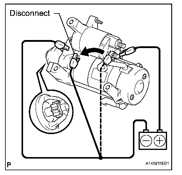 1. Disconnect the negative (-) terminal lead from terminal C with the condition specified in the pull-in test above being maintained. Check that the pinion gear remains out.