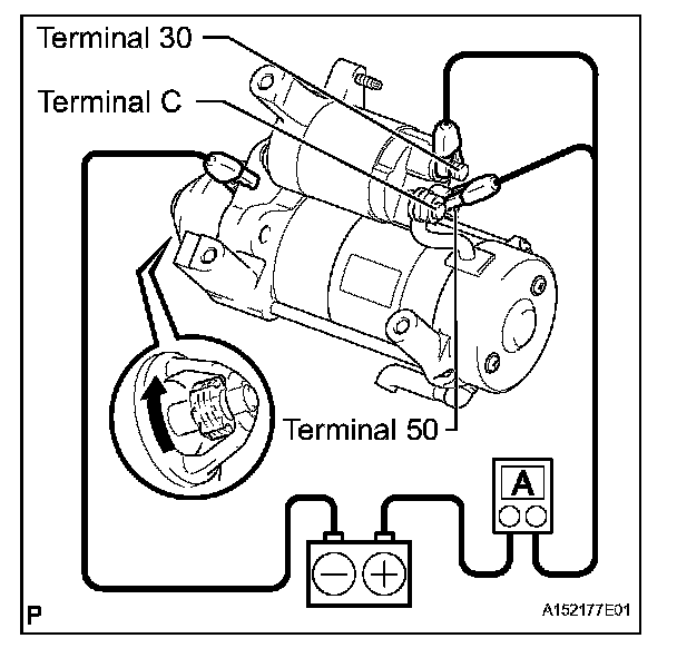 3. Connect the battery and an ammeter to the starter as shown in the illustration.