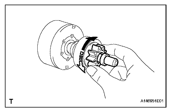 2. Try to rotate the clutch pinion gear counterclockwise, and check that it locks. If the clutch pinion gear cannot be turned clockwise smoothly, or does not lock in the counterclockwise direction, replace the starter center bearing clutch sub-assembly.