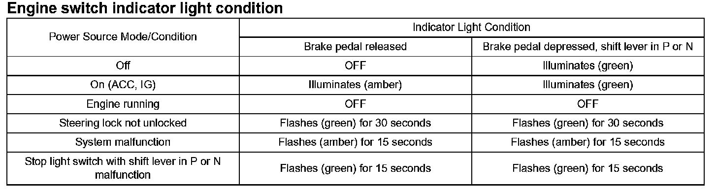 Engine start conditions or system malfunctions can be checked by observing the status of the engine switch indicator light.