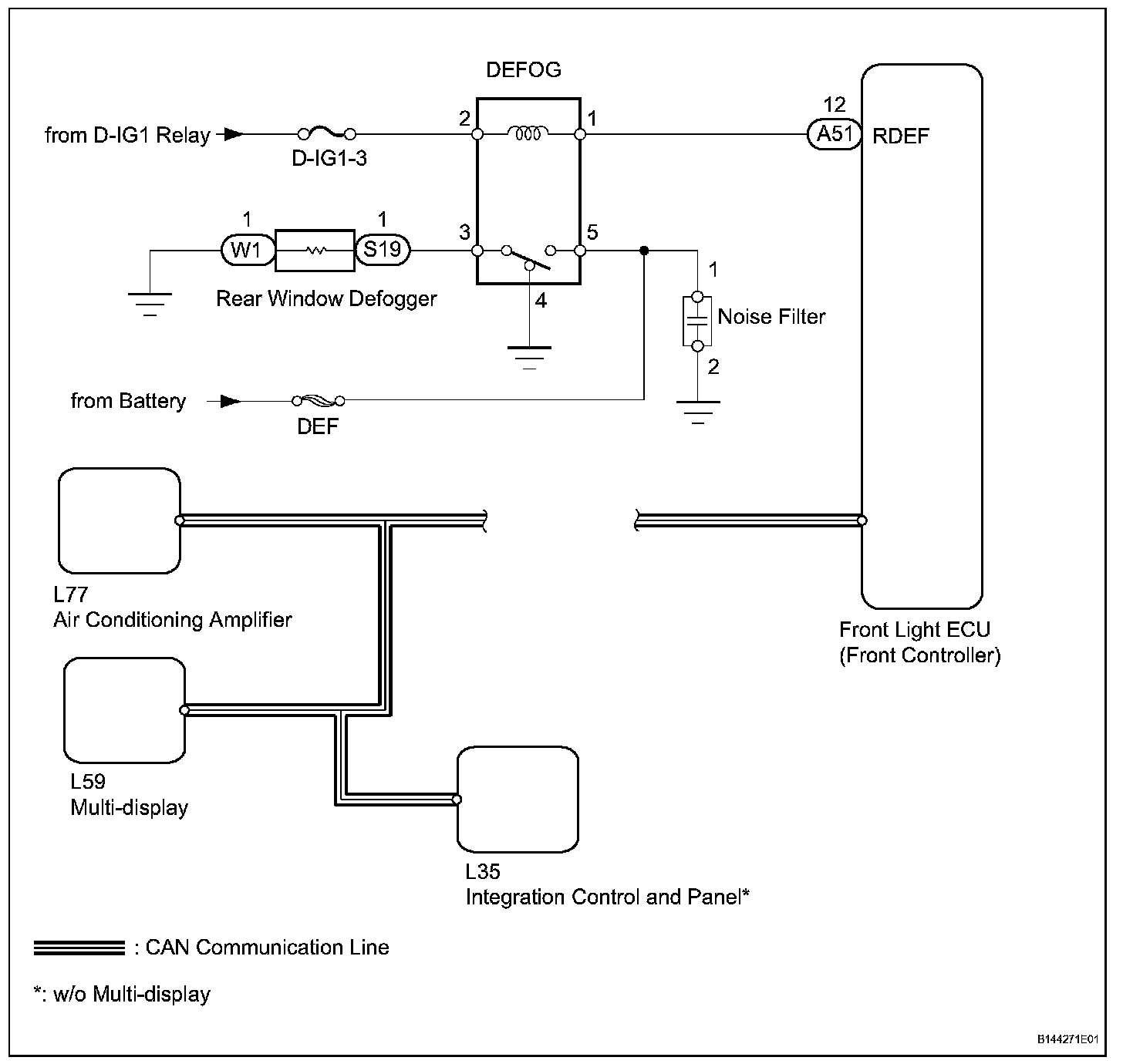 When the rear window defogger switch turns ON, a rear defogger activation request signal from the air conditioning amplifier is sent via the CAN line to the front light ECU. Then the front light ECU operates the rear window defogger.