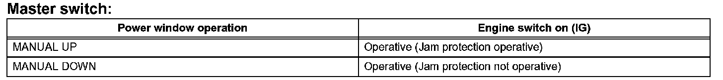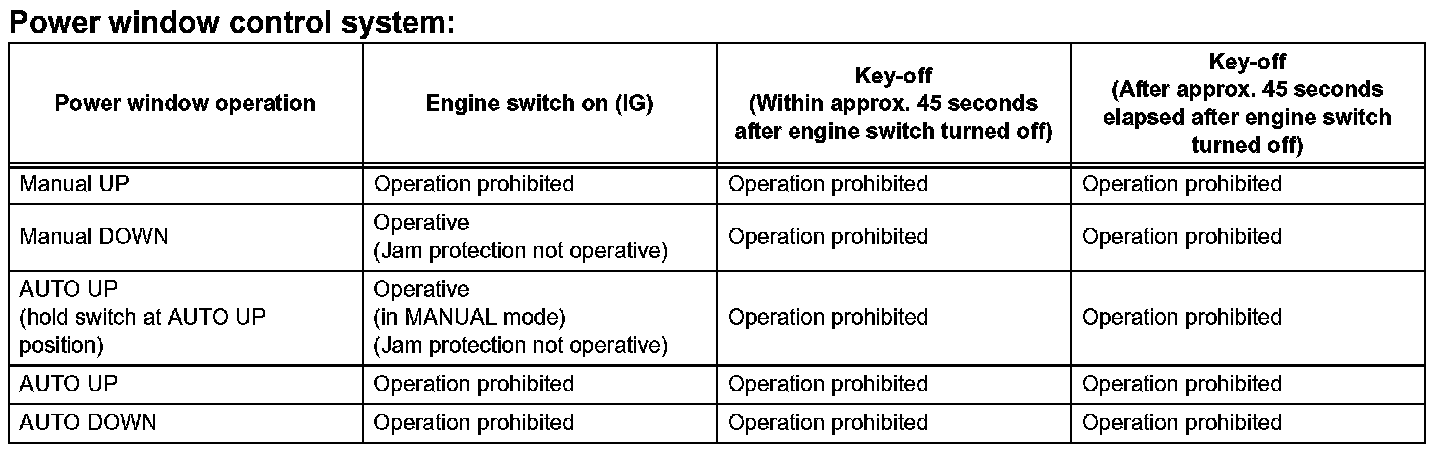 a. The power window control system prohibits the following power window operation when the pulse sensor for the jam protection function has problems and the window position or the learned value is abnormal.