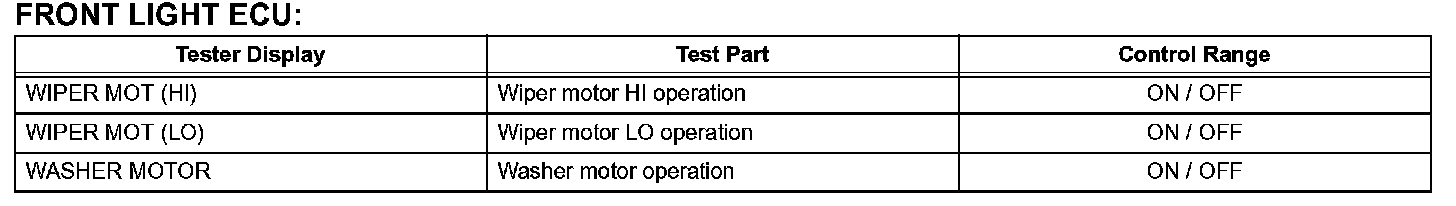 NOTE: When a BODY (front light ECU) related vehicle switch is ON, Active Test items related to the vehicle switch are prohibited (double operation prohibition). Check that the vehicle switches are OFF before performing Active Tests.