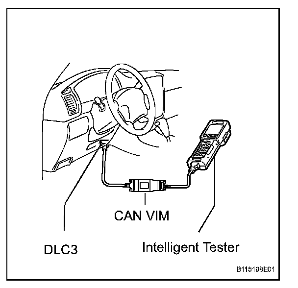 HINT: Connect the cable of the intelligent tester (with CAN VIM) to the DLC3, turn the ignition switch ON and attempt to use the tester. If the display indicates that a communication error has occurred, there is a problem either with the vehicle or with the tester.