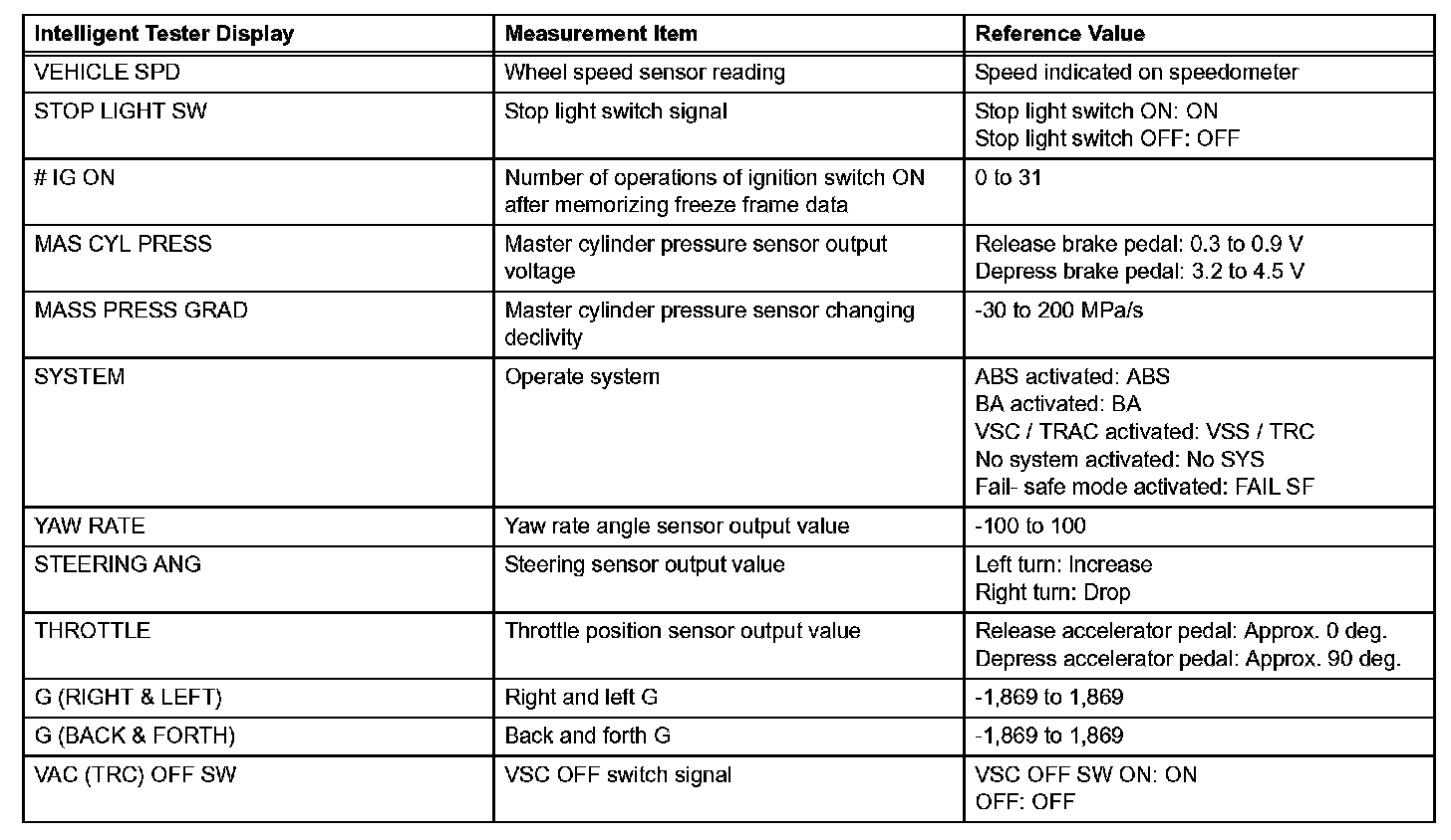 - When a DTC is detected or the ABS operates, the skid control ECU stores the current vehicle (sensor) state as freeze frame data.