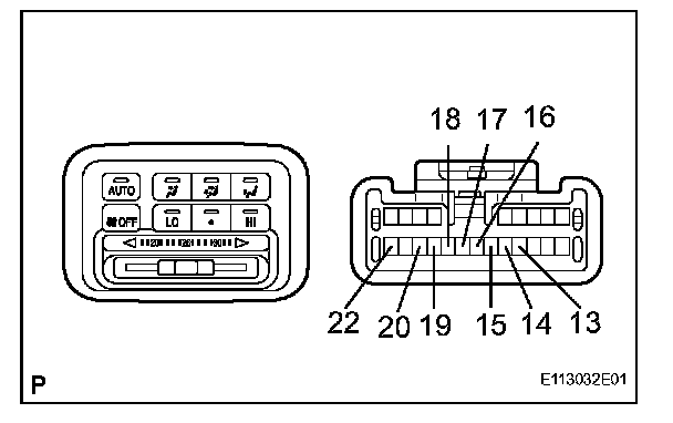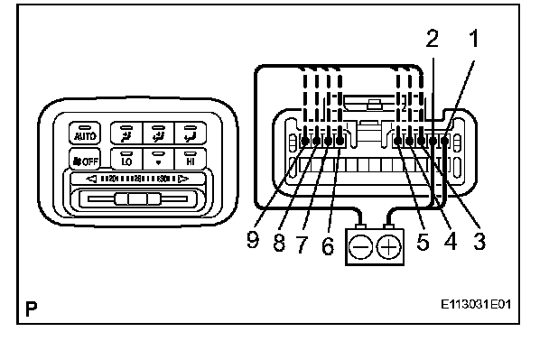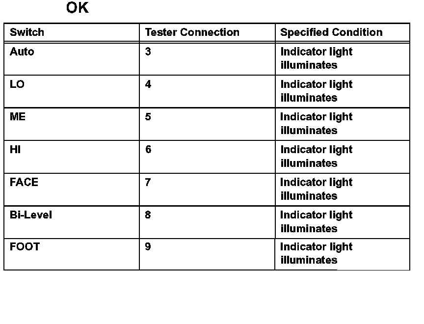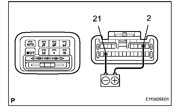 a. Connect the positive (+) lead from the battery to terminal 1 and negative (-) lead to each of the other terminals in order from 3 to 9, and then check that the indicator illuminates as shown in the chart.