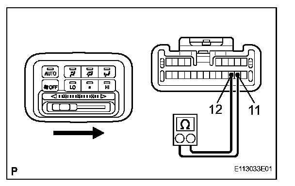 b. Gradually move the temperature control lever from "COOL" side to "WARM" side, and then check that the resistance between terminals 11 and 12 increases to 3.0 k ohms.