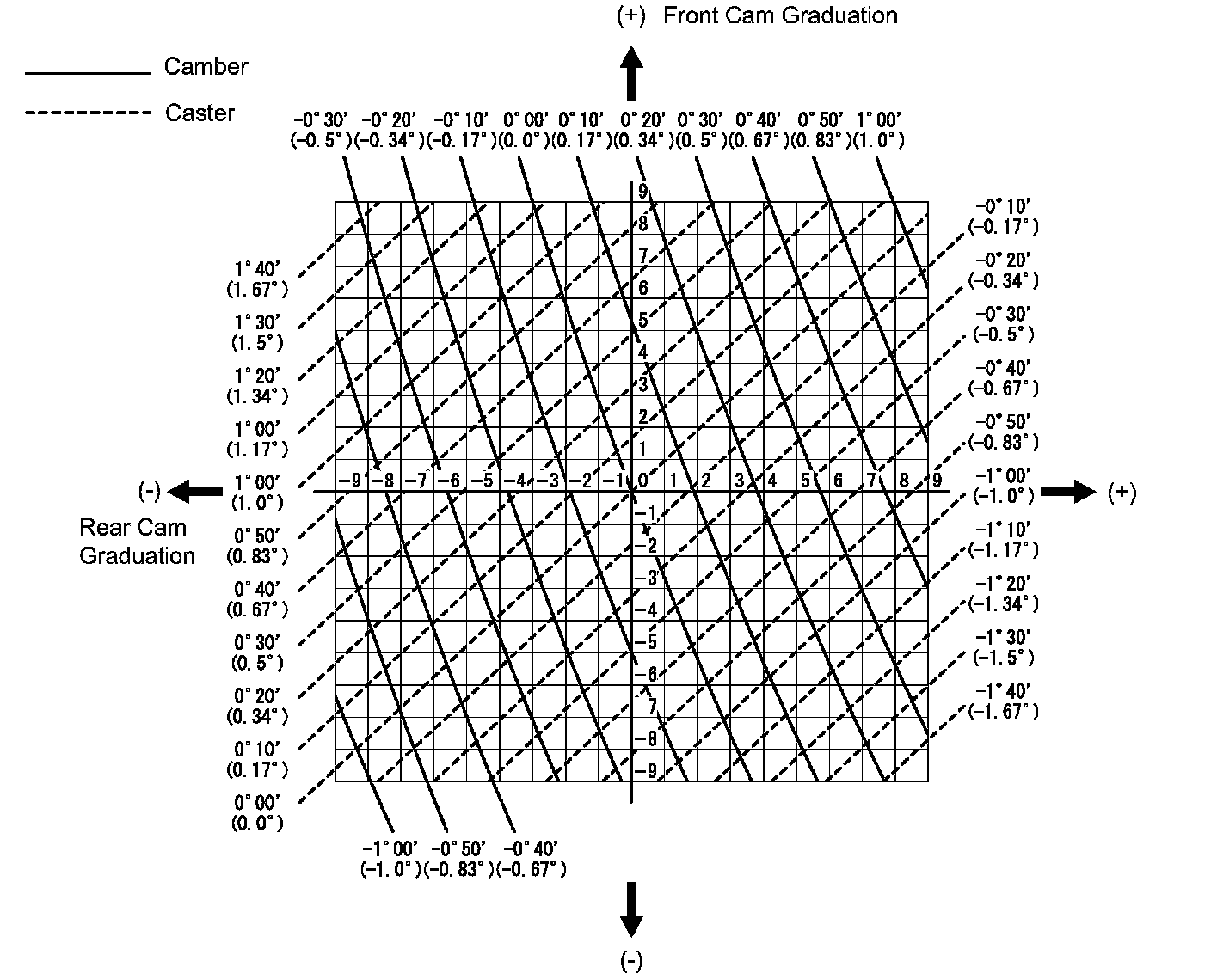 3. As shown in the chart, read the distances from the marked point to the 0 point, and adjust the front and/or rear adjusting cams accordingly