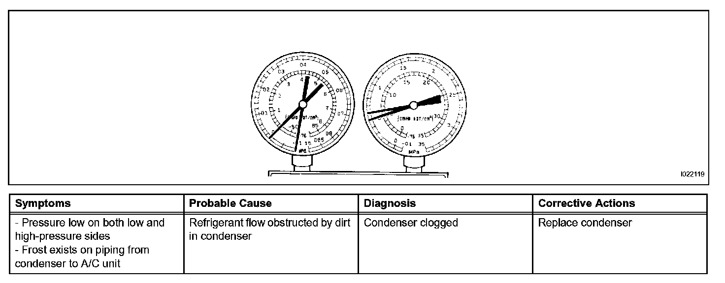 6 The A/C system does not function effectively due to overcharged refrigerant or insufficient cooling of the condenser.