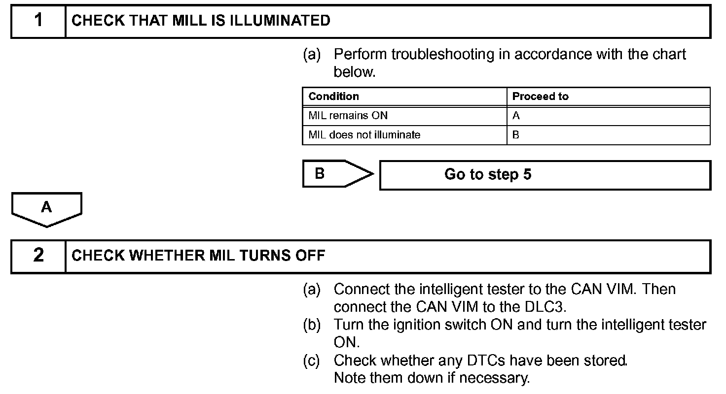 The MIL should be illuminated when the ignition switch is turned ON. If the MIL is always ON or OFF, use the intelligent tester and follow the procedures to determine the cause of the problem.