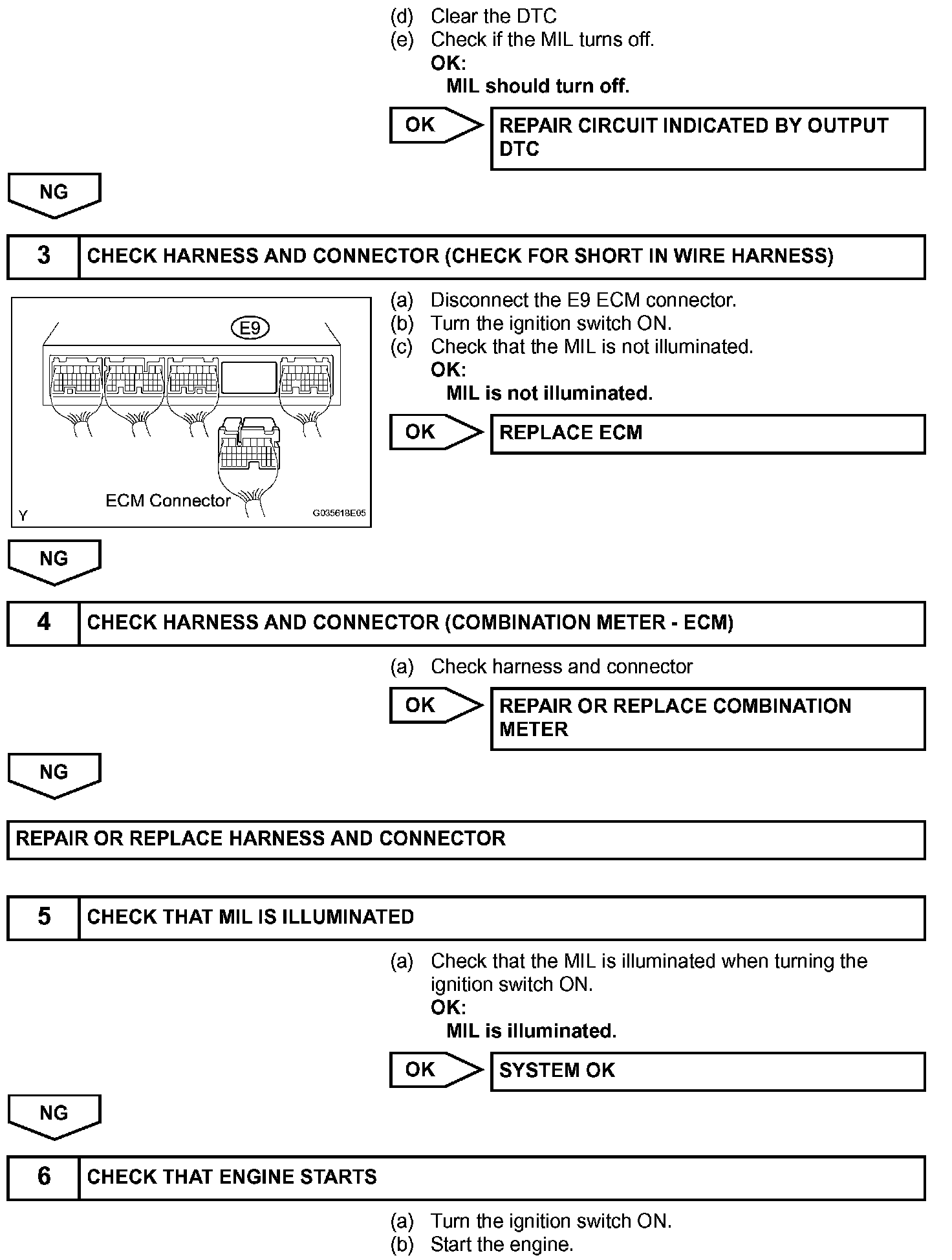 If the ECM detects trouble, the MIL illuminates. At this time, the ECM records a DTC in the memory.