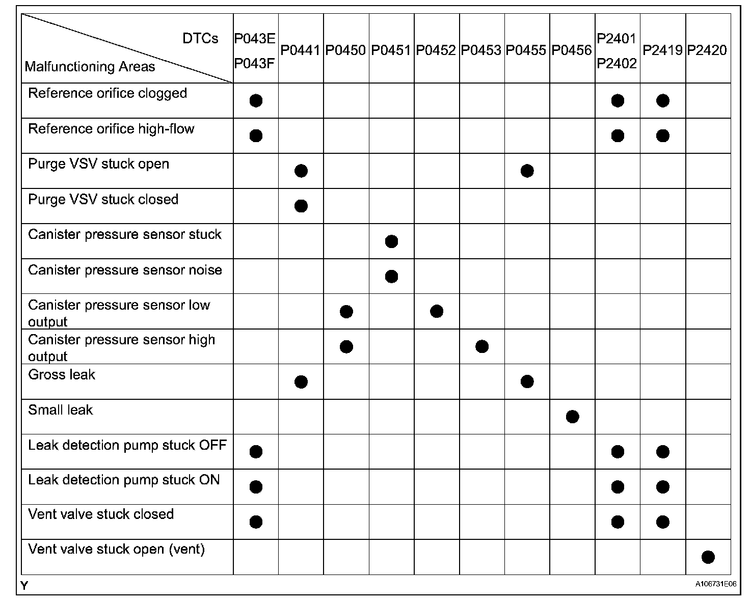 If any EVAP system DTCs are set, the malfunctioning area can be determined using the table.
