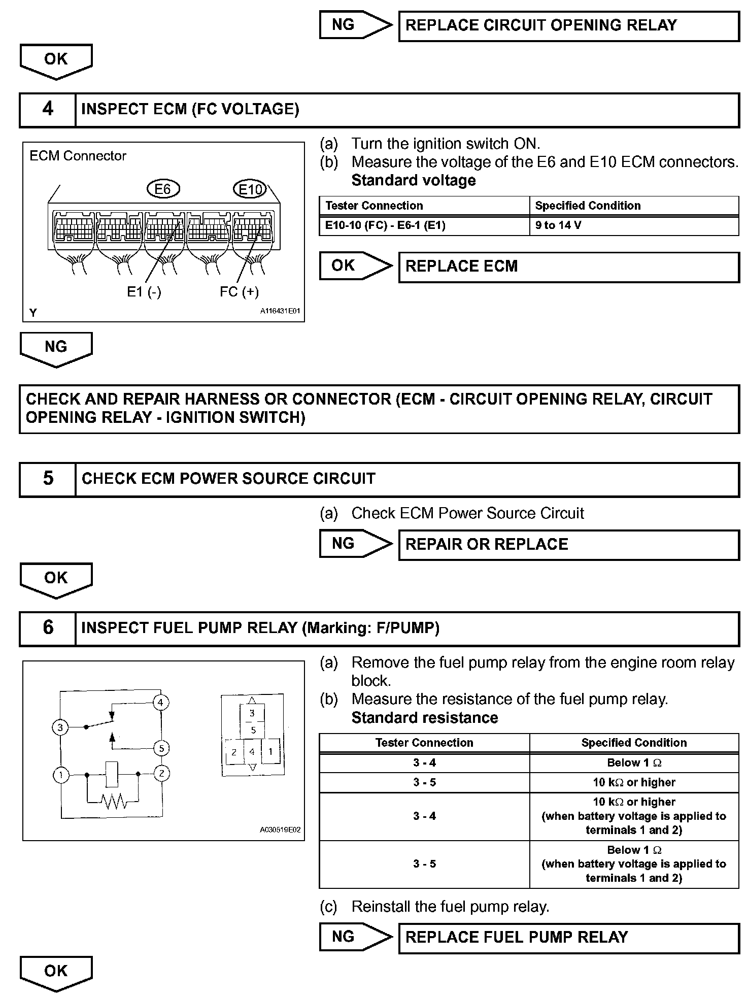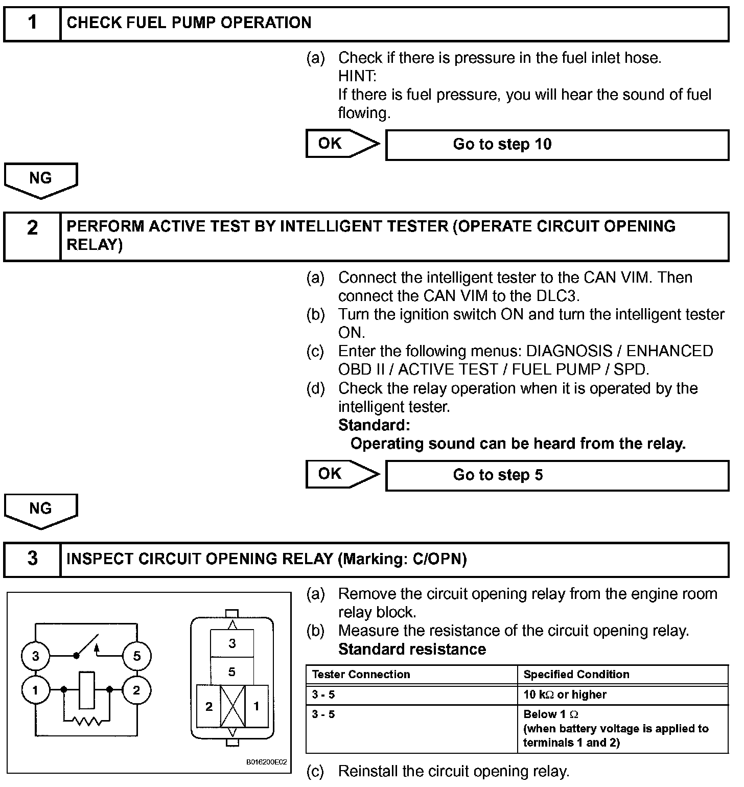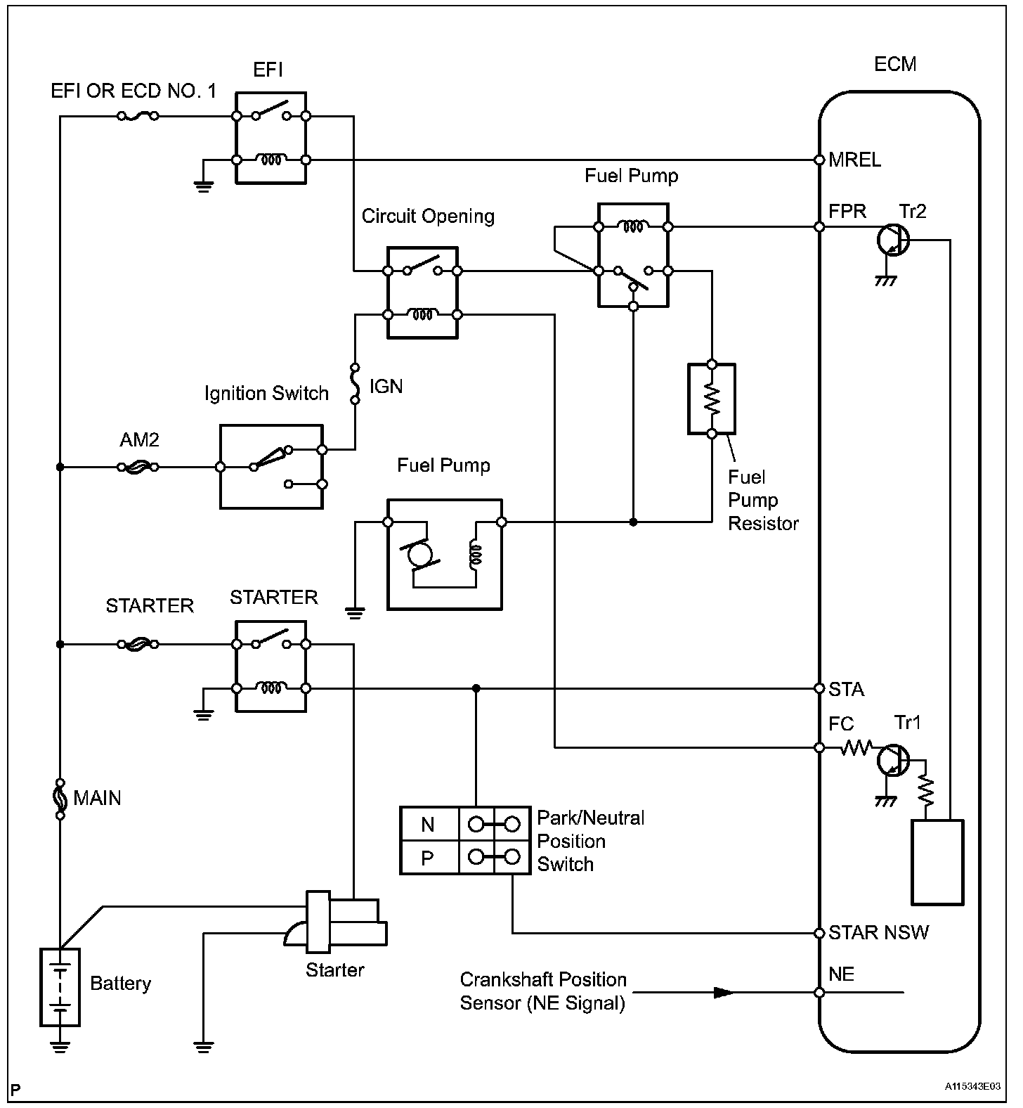 When the STA signal and NE signal are input to the ECM, the Tr1 (power transistor 1. is turned ON, current flows to the coil of the circuit opening relay (Marking: C/OPN), the relay switches on, power is supplied to the fuel pump, and the fuel pump operates.