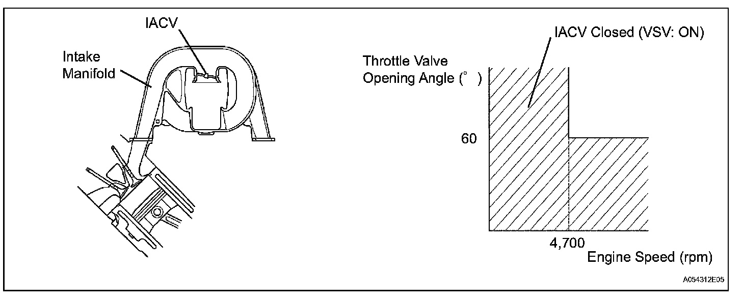 When the engine speed is 4,700 rpm or more and the throttle valve opening angle is 60° or more, the IACV is open (VSV: OFF). At all other times, the IACV is closed (VSV: ON).