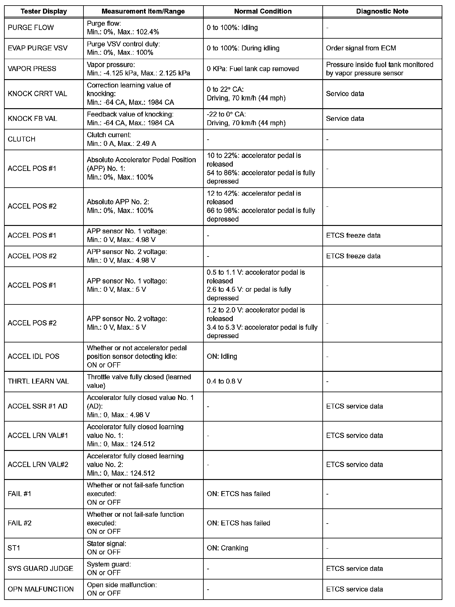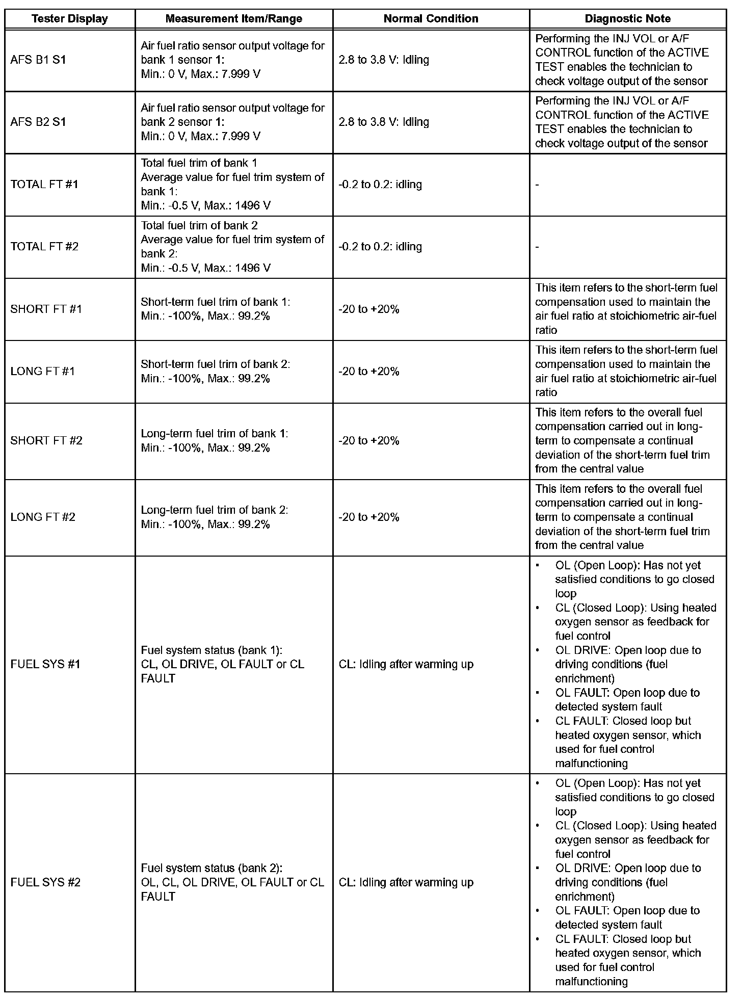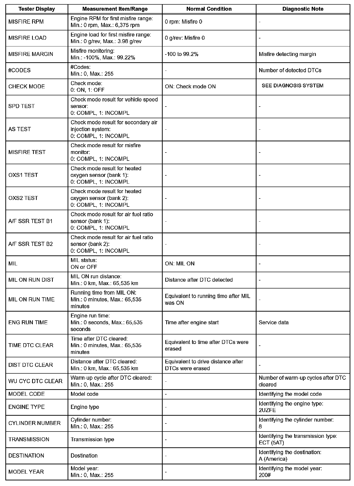NOTE: In the table, the values listed under "Normal Condition" are reference values. Do not depend solely on these reference values when deciding whether a part is faulty or not.