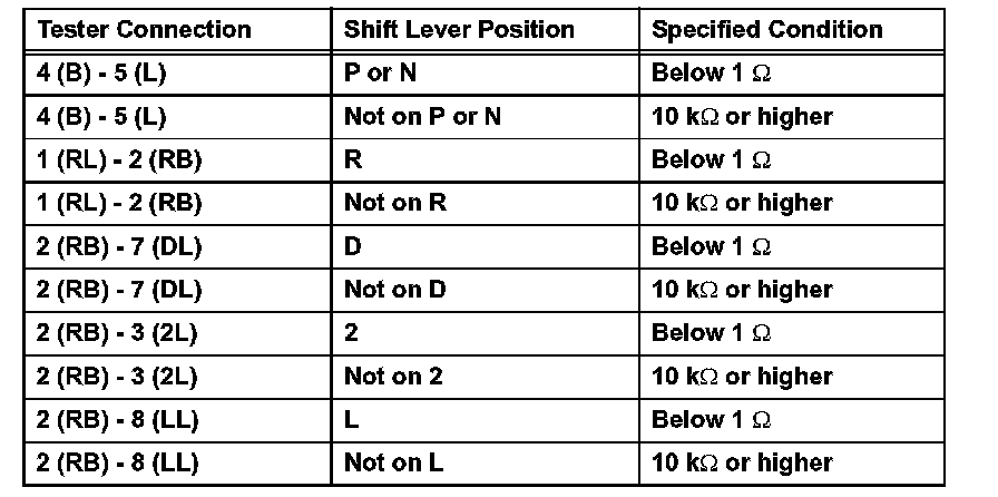 Measure the resistance of the PNP switch when the shift lever is moved to each position.
