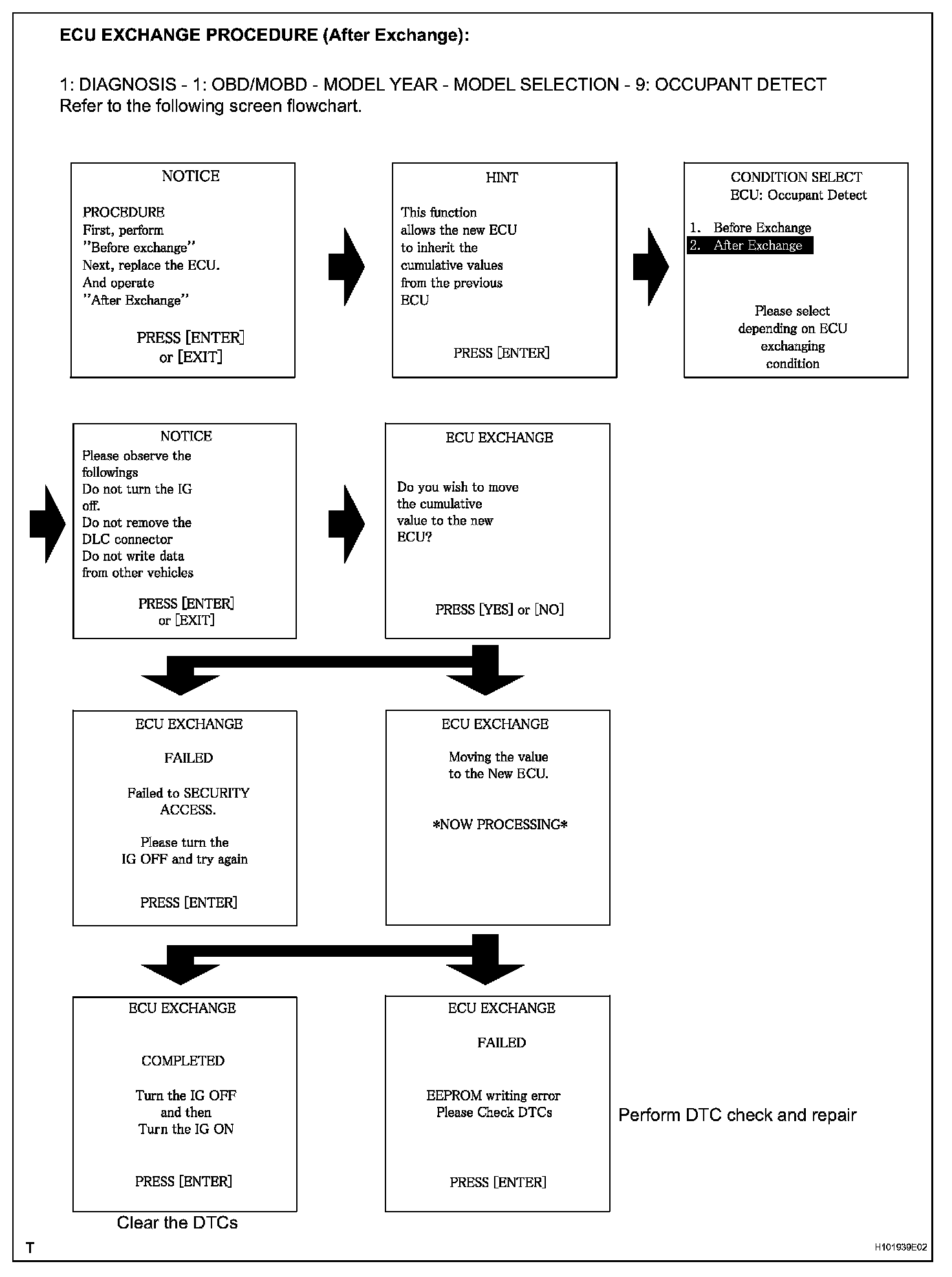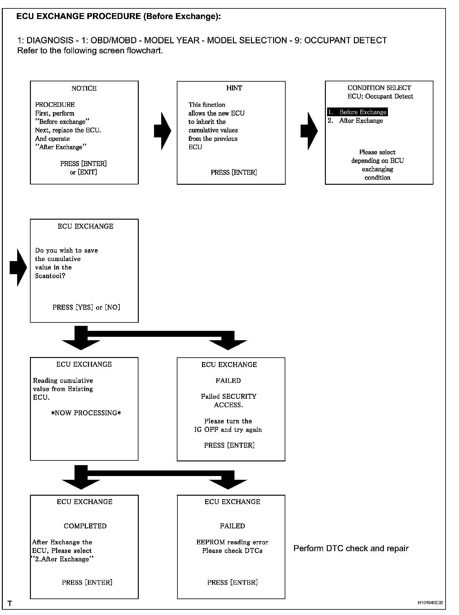 - ECU EXCHANGE PROCEDURE (Before Exchange) describes the procedure to save the data of the occupant classification ECU installed in the vehicle into the intelligent tester. ECU EXCHANGE PROCEDURE (After Exchange) describes the procedure to load the data from the previous ECU, stored in the intelligent tester, into the new ECU.