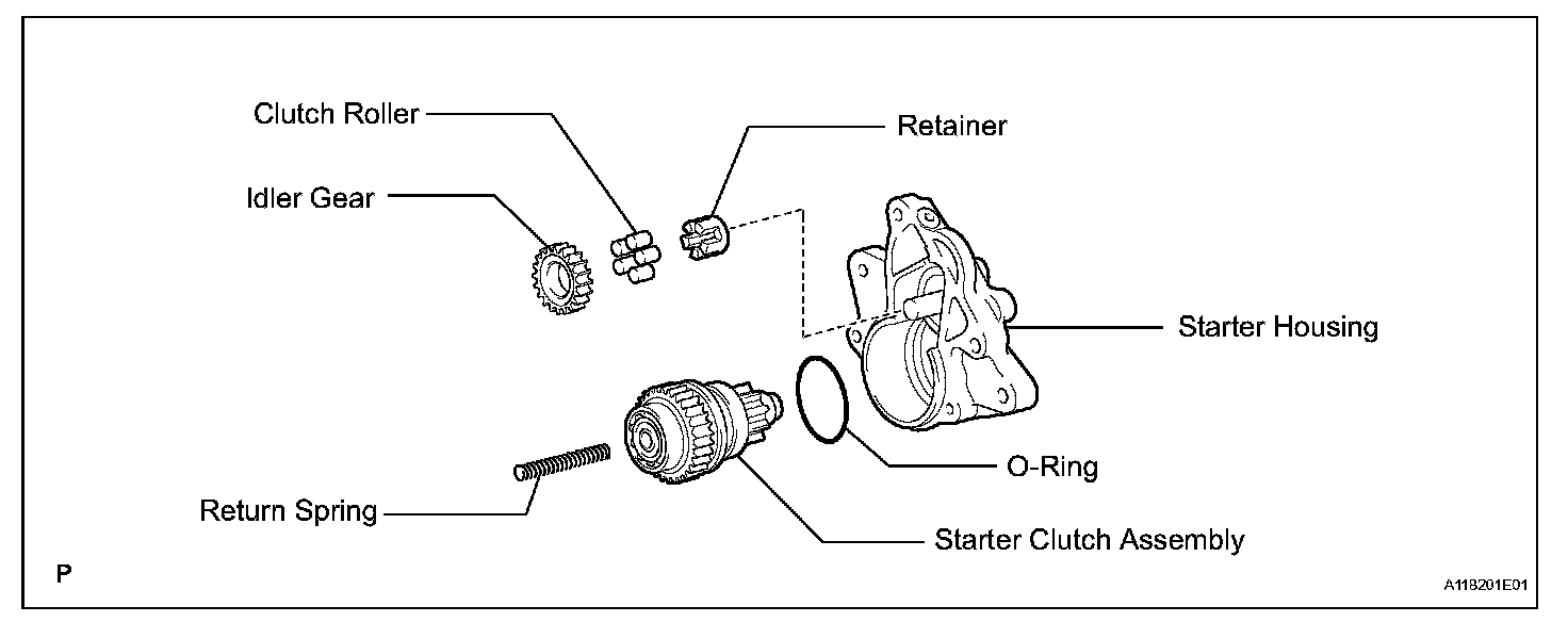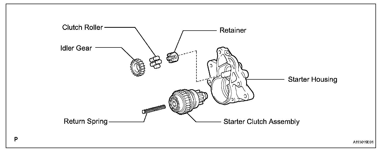 b. Remove the return spring, idler gear, clutch roller, retainer and starter clutch from the starter housing.