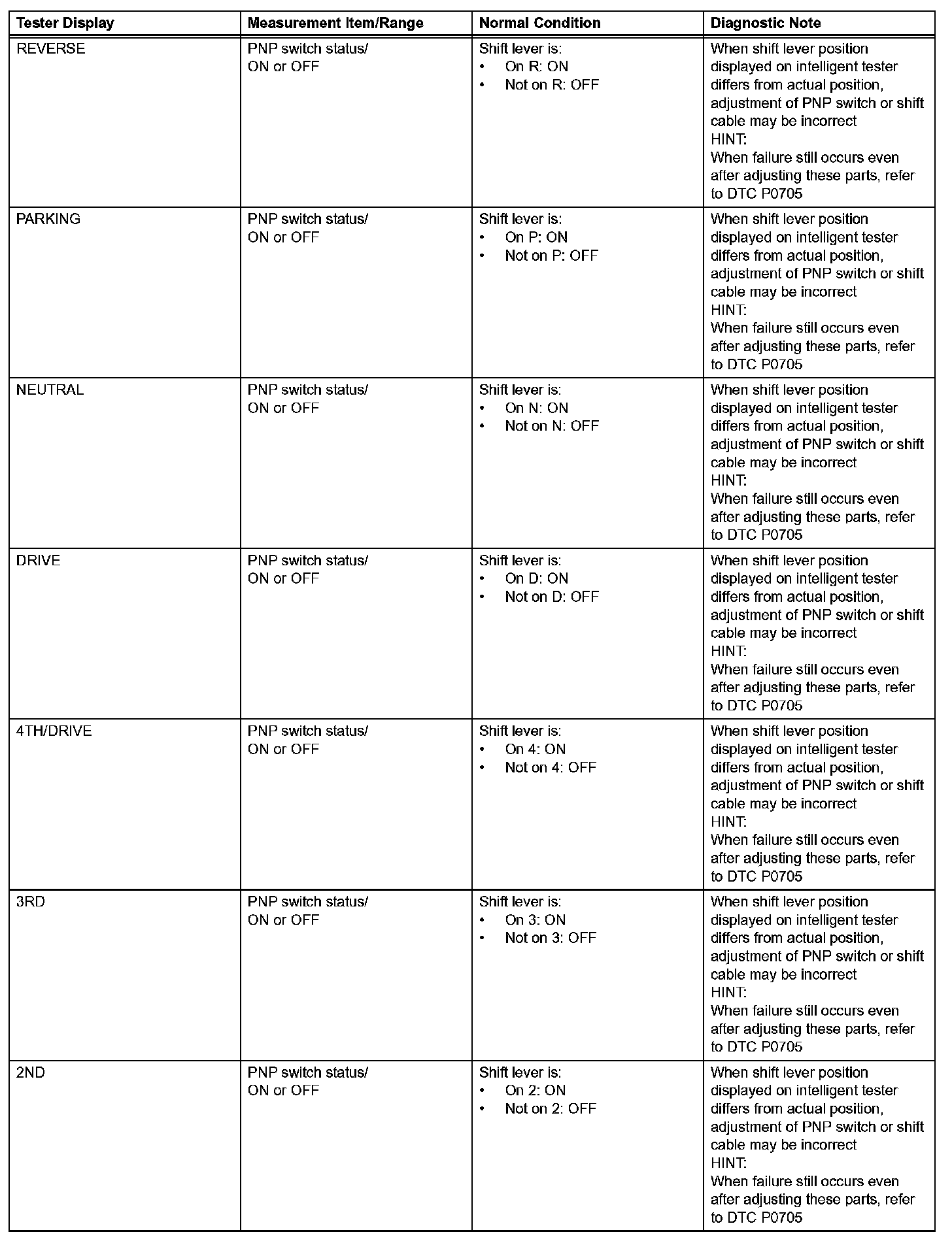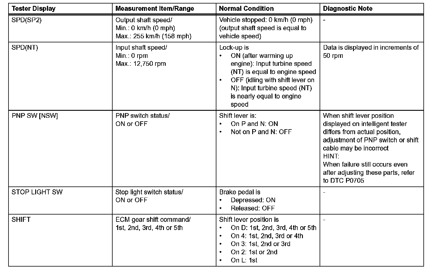 NOTICE: In the table, the values listed under "Normal Condition" are reference values. Do not depend solely on these reference values when deciding whether a part is faulty or not.