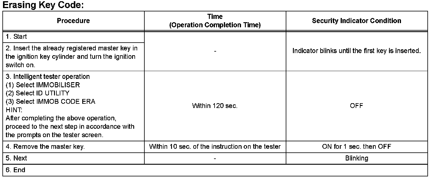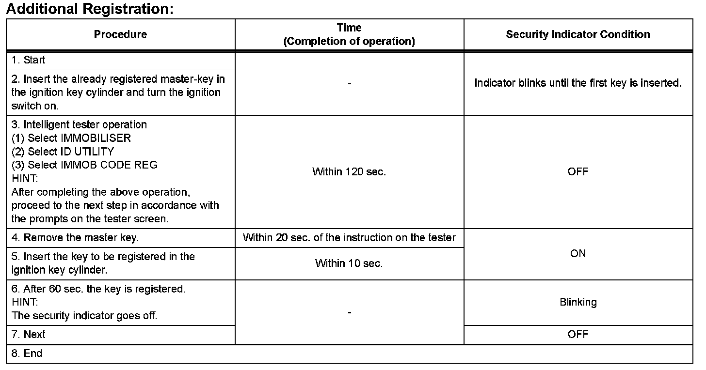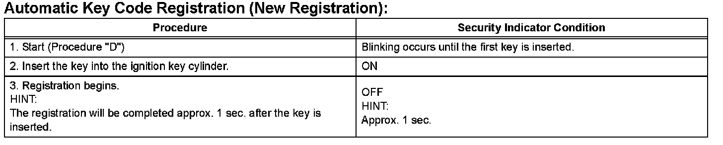 HINT: The key has 2 codes: The key code (immobilizer code) and the wireless code. Both of these codes need to be registered. Refer for the wireless code registration procedures.
