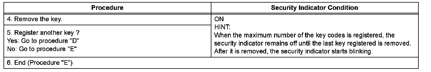 NOTE: If the key code registration has failed in automatic key code registration mode, code 2-1 will be output from the security indicator. Trying to register an already registered key will cause code 2-2 to be output when the key is inserted. If the number of registered key codes exceeds the limit, code 2-3 will be output from the security indicator. The output details are shown in procedure "B".