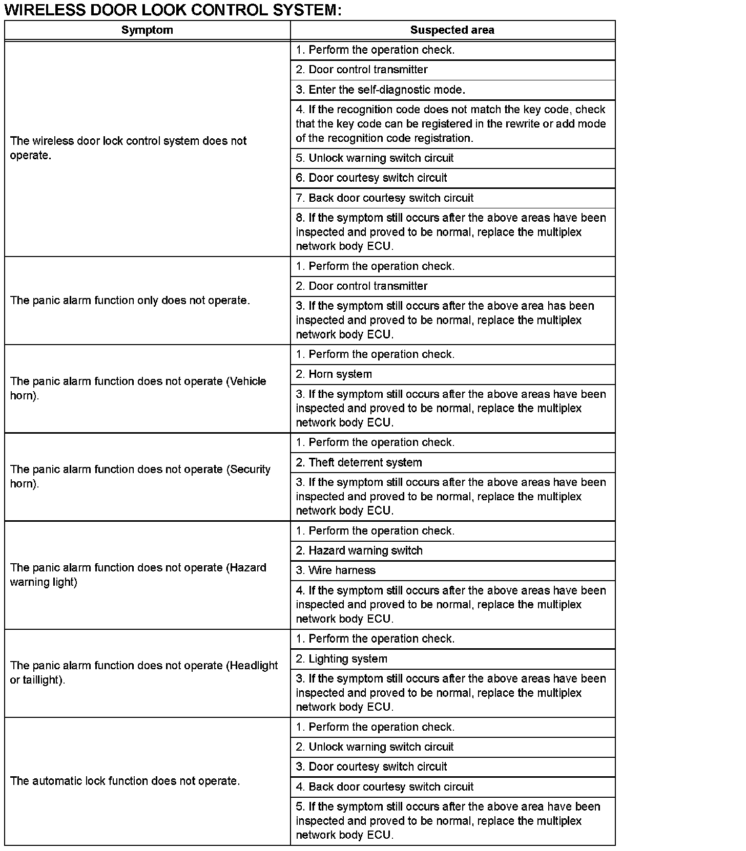 If a normal system code is displayed during the DTC check, but the problem still occurs, check the circuits for each problem symptom in the order given in the table and proceed to the relevant troubleshooting.