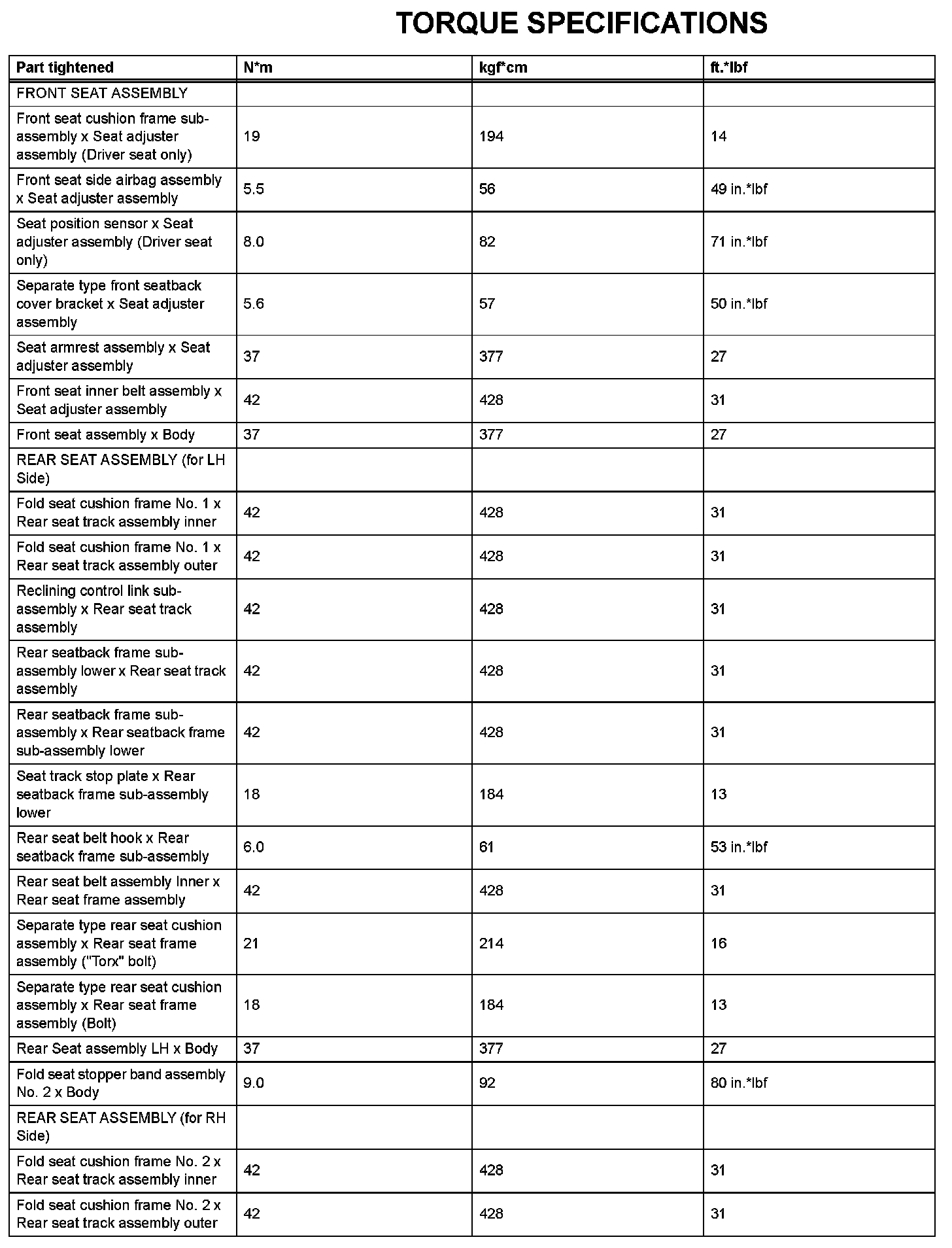 Seat - Torque Specifications (Part 2):