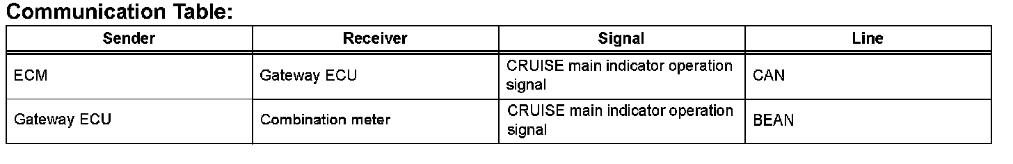 - The ECM illuminates the combination meter's CRUISE main indicator light when it receives a cruise control main switch ON signal.