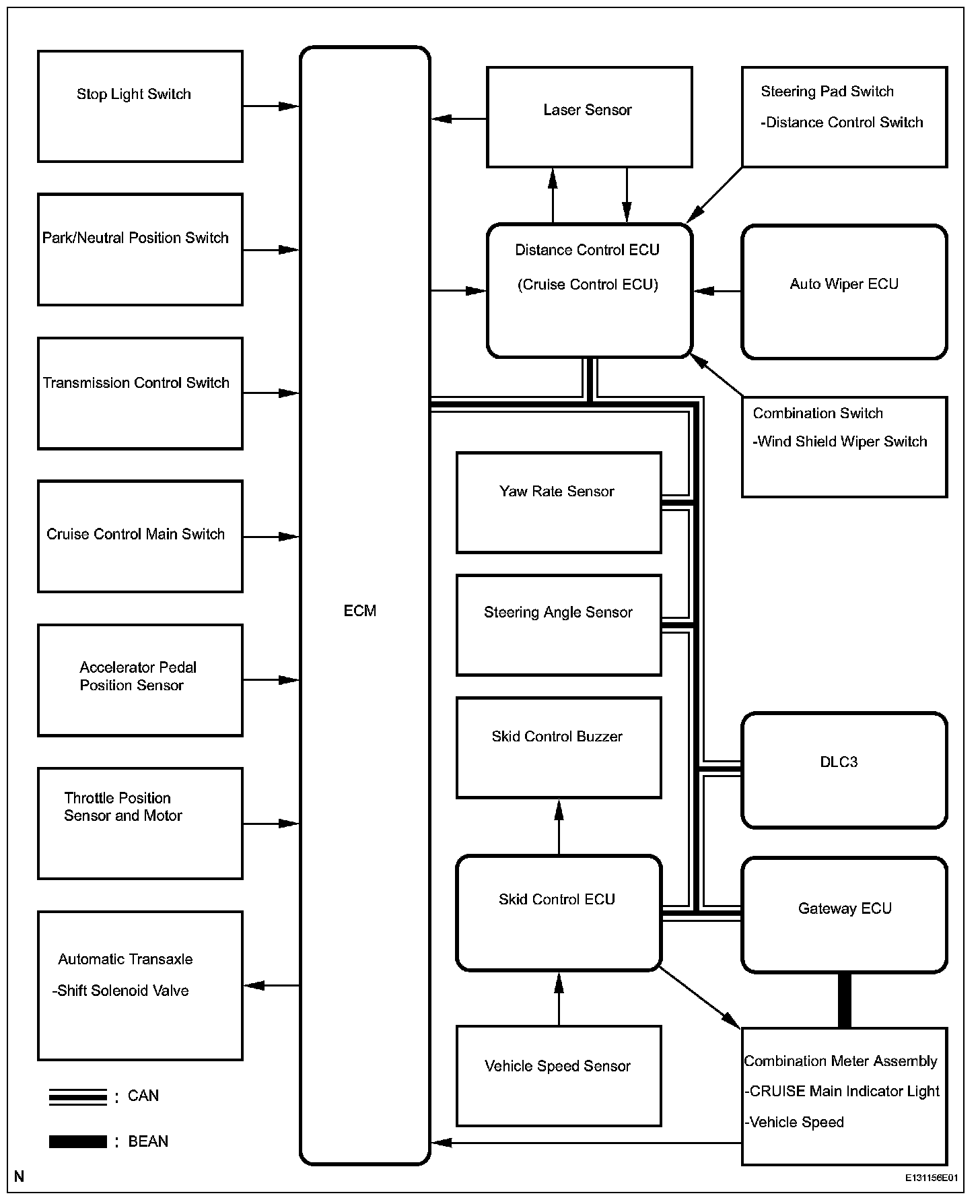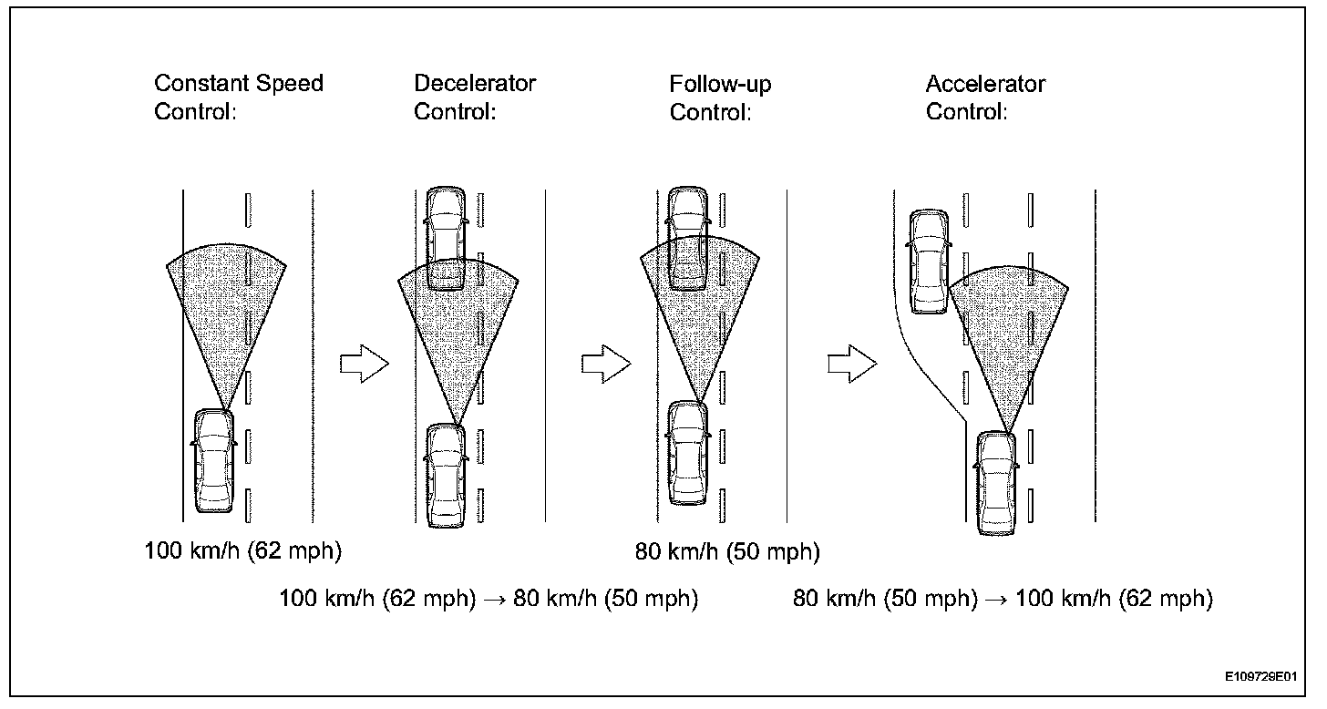 e. In vehicle-to-vehicle distance control mode, the dynamic laser cruise control system receives signals from the yaw rate (deceleration sensor) and the steering angle sensor. Based on these signals, it then estimates curve radius and compensates for information on the preceding vehicle while turning. It can also compensate for the brake control when approaching another vehicle.