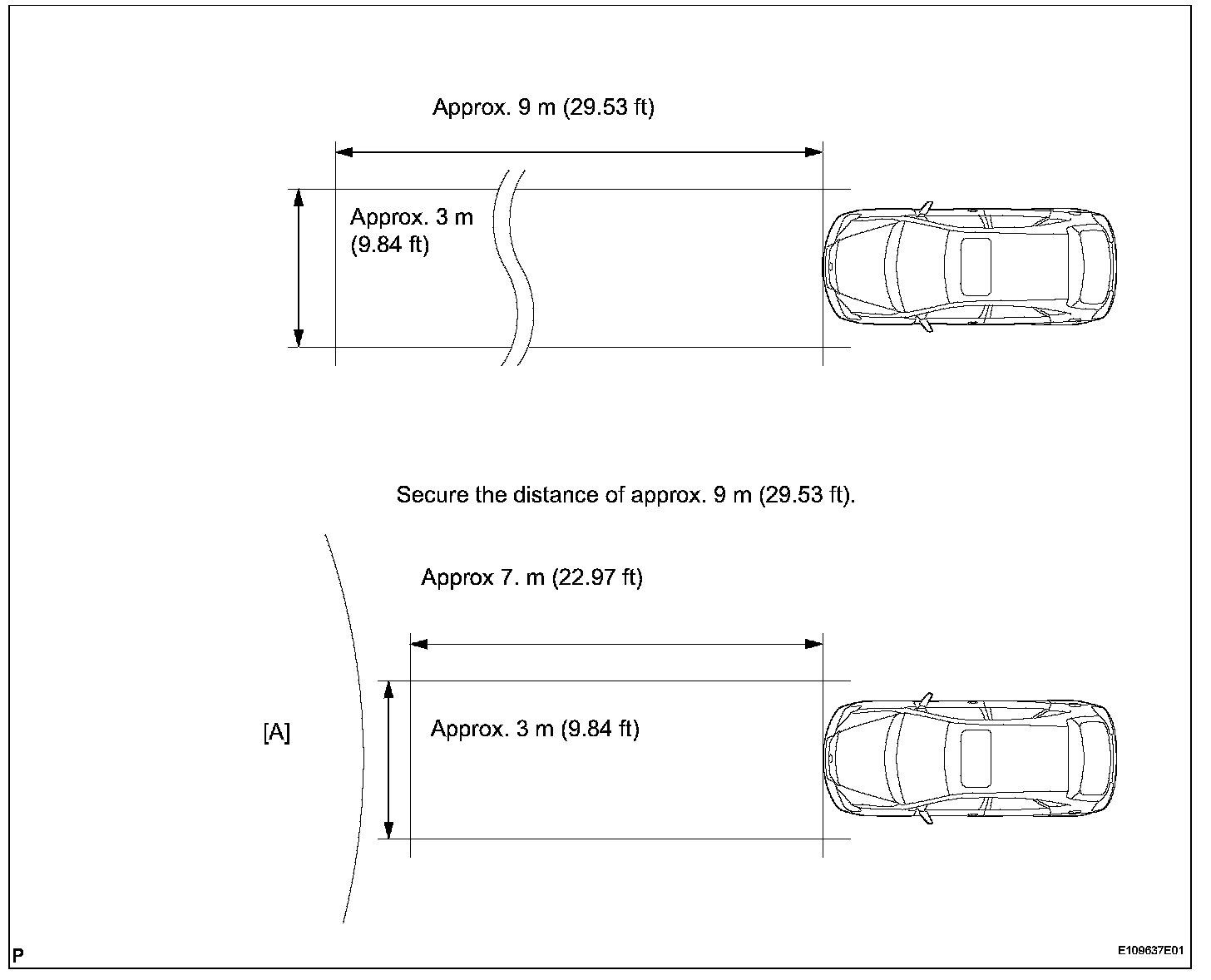 - If it is impossible to secure a distance of approximately 9 m (29.53 ft) in front of the vehicle, be sure to secure at least 7 m (22.97 ft) from the vehicle, and cover the area marked [A] with a black cloth. If not covered with a black cloth, the laser sensor may detect something other than the target and adjustment cannot be done properly.