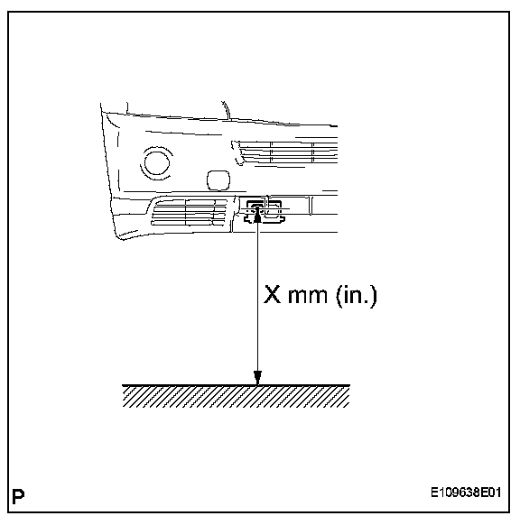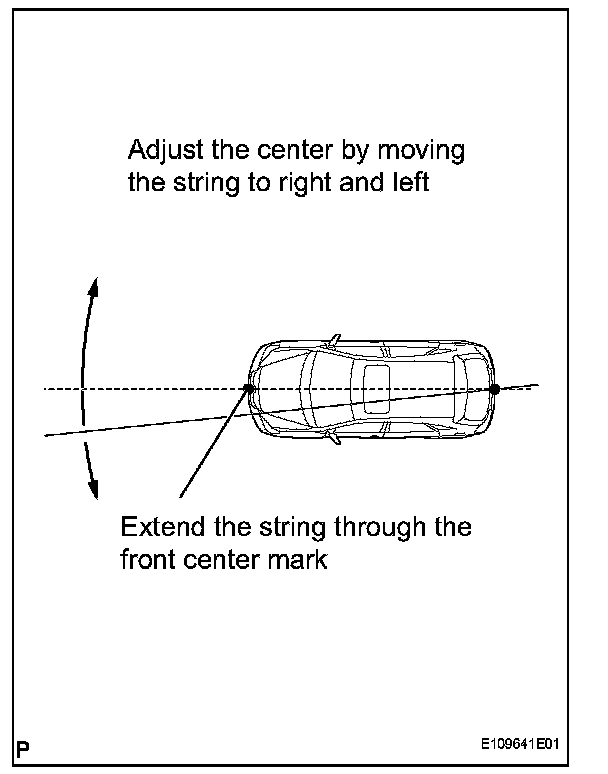 3. From the center (center of the emblem) of the front and rear bumpers, hang down the string with the plumb bob and mark the center points (both front and rear) of the vehicle on the ground surface.