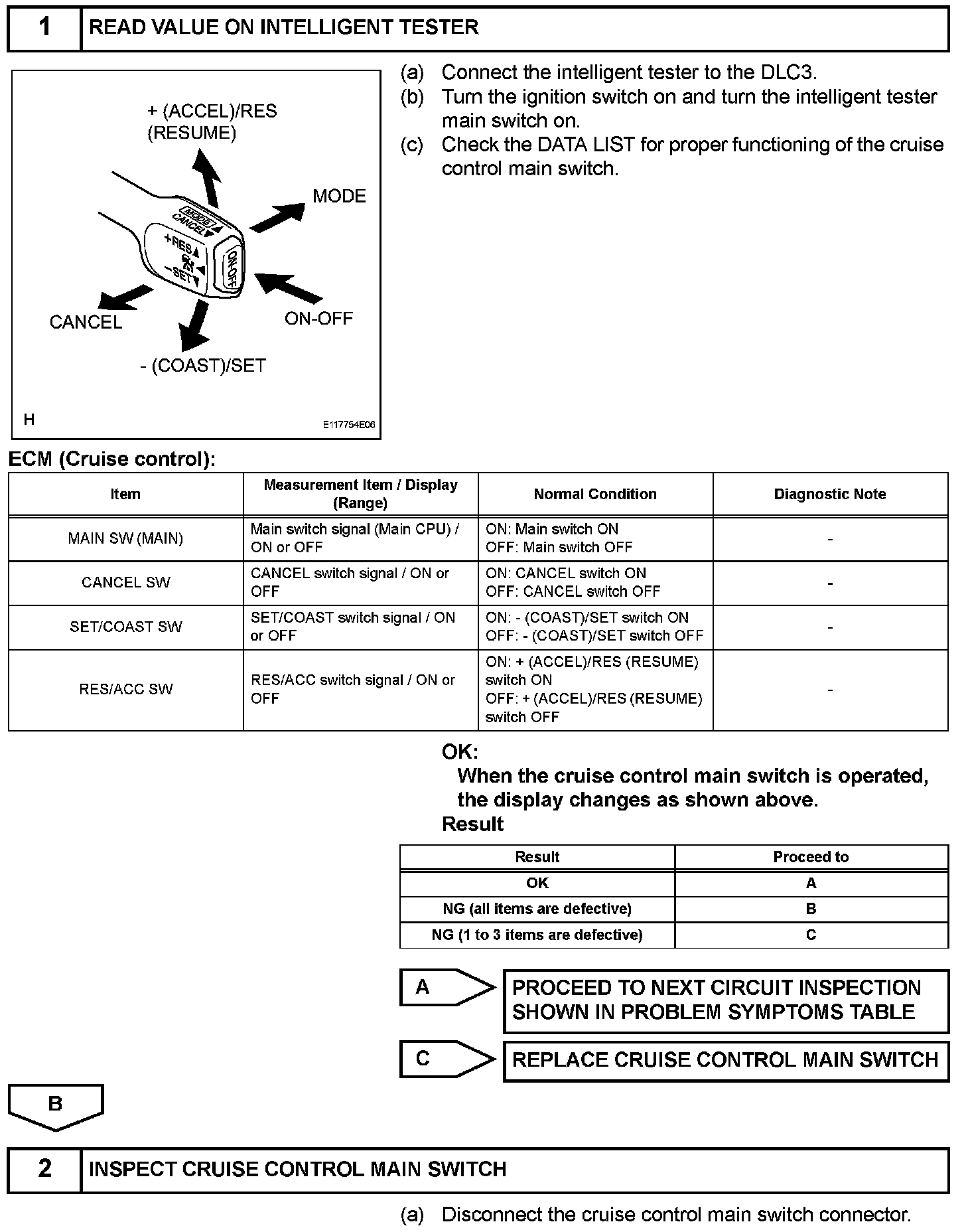 The cruise control main switch operates 8 functions: SET, - (COAST), TAP-DOWN, RES (RESUME), + (ACCEL), TAP-UP, CANCEL, and MODE. The SET, TAP-DOWN, and - (COAST) functions, and the RES (RESUME), TAP-UP, and + (ACCEL) functions are operated with the same switch. The cruise control main switch is an automatic return type switch which turns on only while operating it in the direction of each arrow and turns off after releasing it. The internal contact point of the cruise control main switch is turned on with the switch operation. The ECM then reads the voltage value that has been changed by the switch operation to control MODE, SET, - (COAST), RES (RESUME), + (ACCEL), and CANCEL. The dynamic laser cruise control system has two cruise control modes: the constant speed control mode and vehicle-to-vehicle distance control mode.