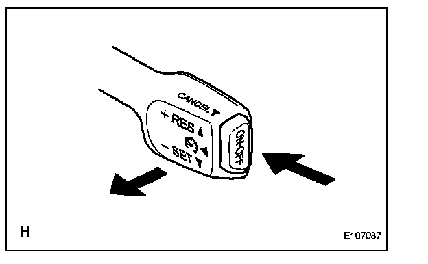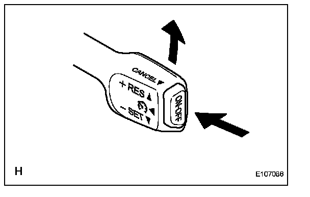 4. Check that vehicle speed increases while the cruise control main switch is pushed to + (ACCEL)/RES (RESUME), and that the vehicle cruises at the newly set speed when the switch is released.