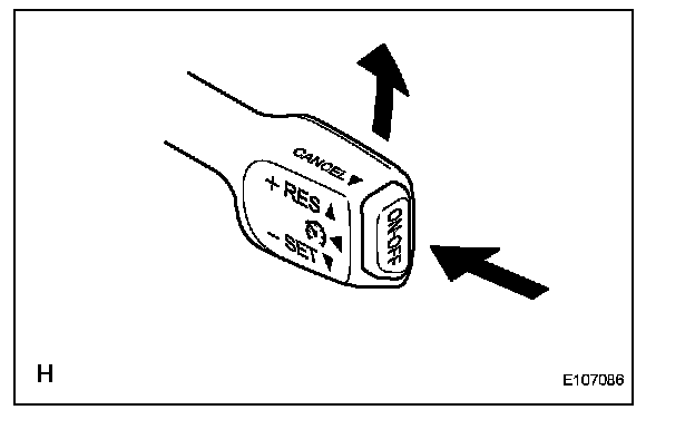 5. Push the cruise control main switch to + (ACCEL)/RES (RESUME) and then release it immediately. Check that vehicle speed increases by approximately 1.6 km/h (1.0 mph) (tap-up control).