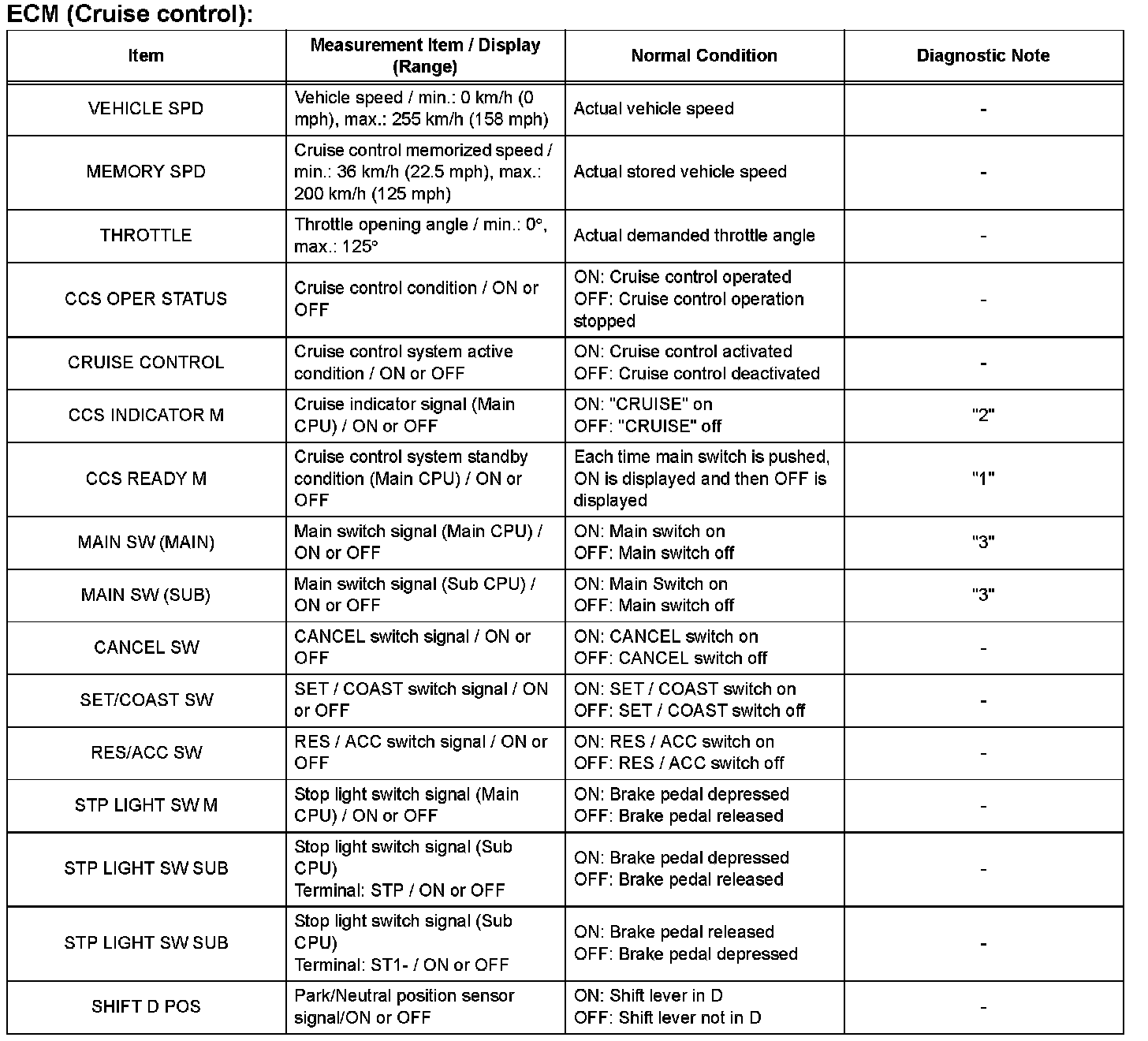 - "3" is OK but CRUISE main indicator light does not illuminate -> CRUISE main indicator light, wire harness, or ECM failure