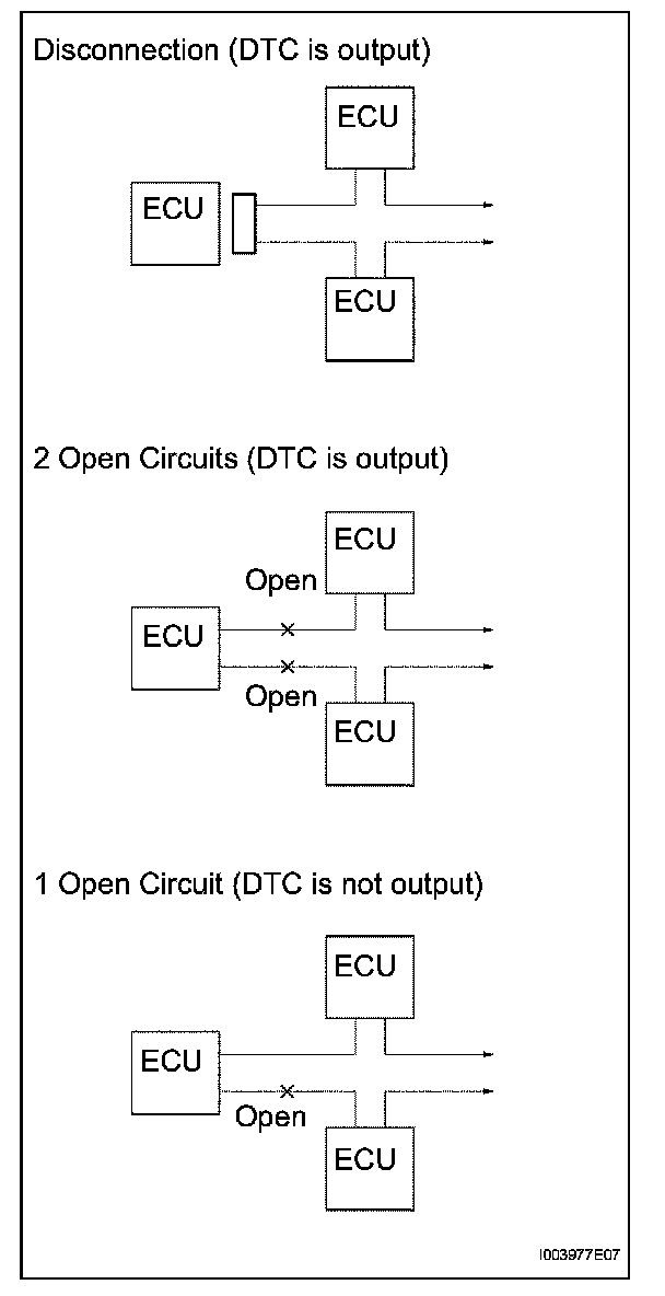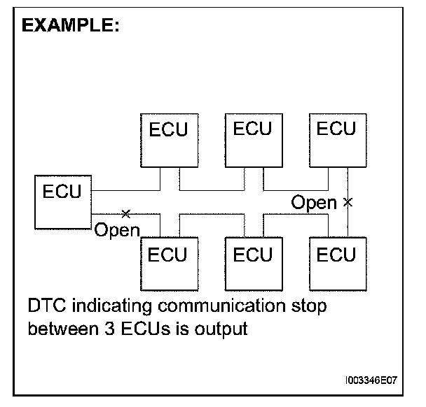 c. If 2 communication buses are open at the positions as given in the illustration, DTC indicating ECU communication stop between those 2 buses is output.