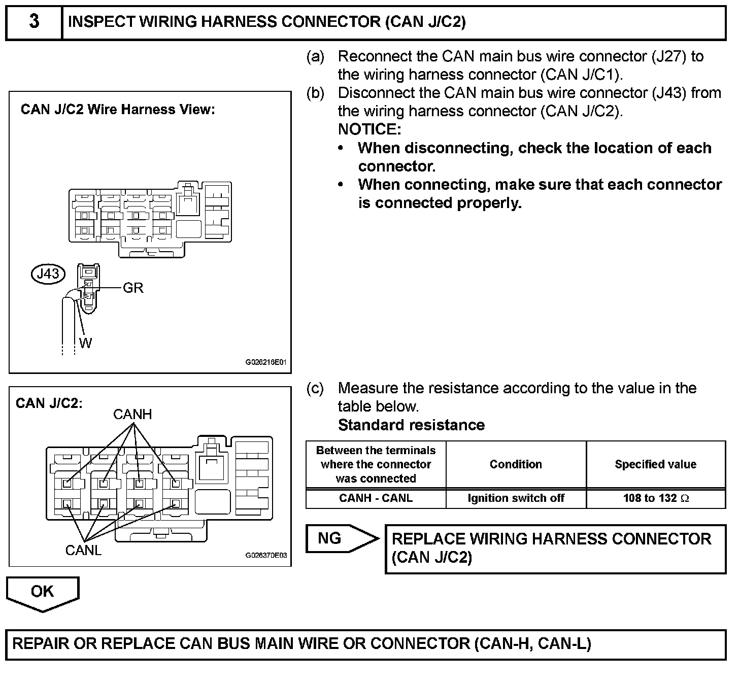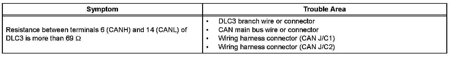 The CAN main bus wire must be disconnected when the resistance between terminals 6 (CANH) and 14 (CANL) of the DLC3 is more than 69 ohms.