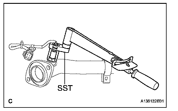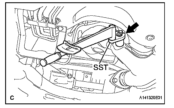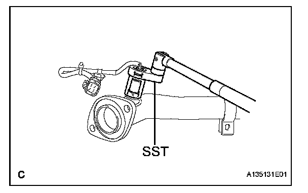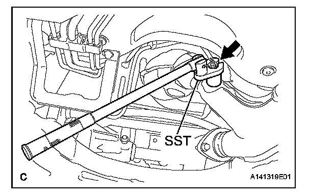 b. Using SST, fully tighten the oxygen sensor to the exhaust front pipe sub-assembly.