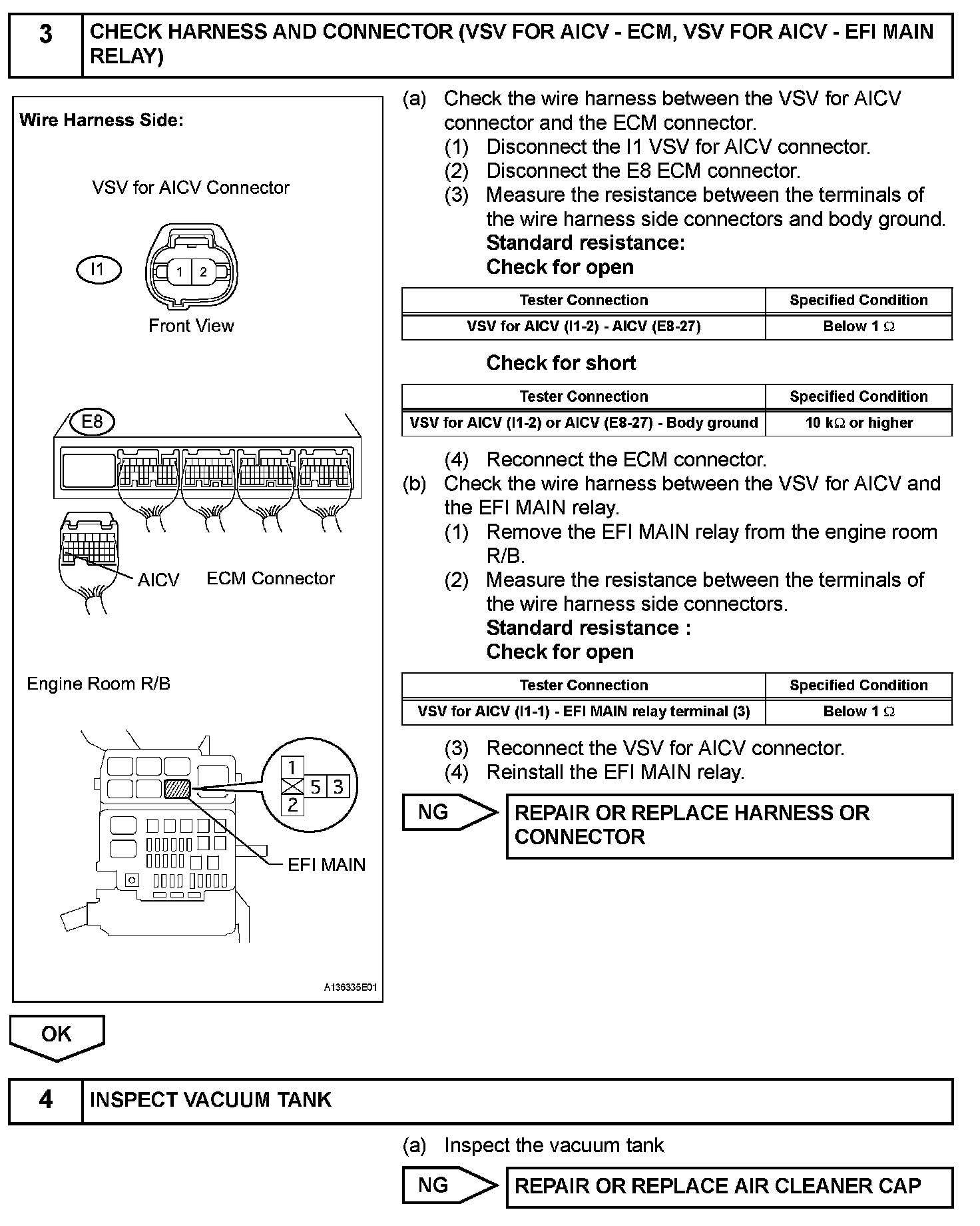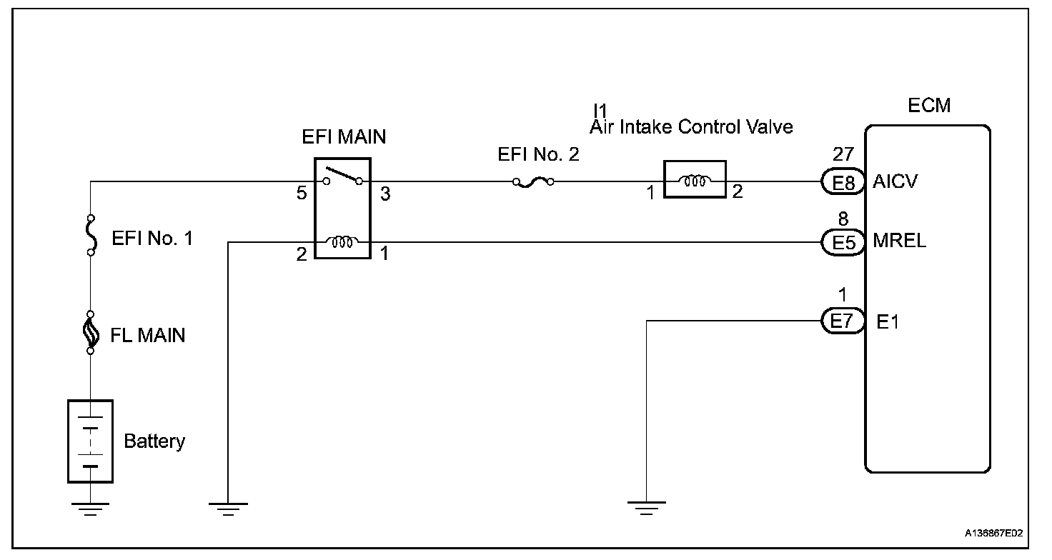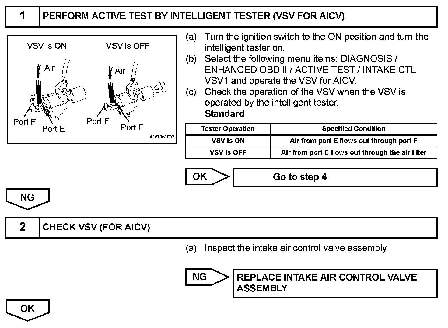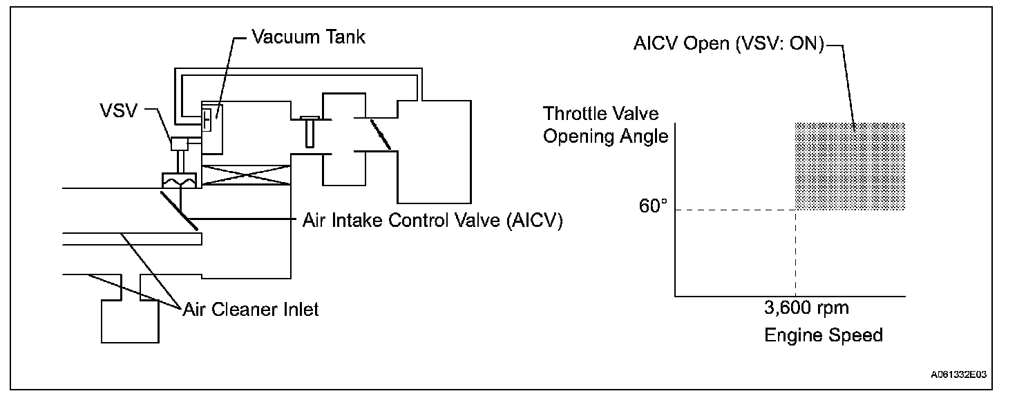 When the engine is operating in the low-to-mid speed range, this control operates the AICV to close one of the air cleaner inlets. When the engine speed is more than 3,600 rpm and the opening angle of the throttle valve is more than 60°, the ECM activates the VSV and opens the AICV.